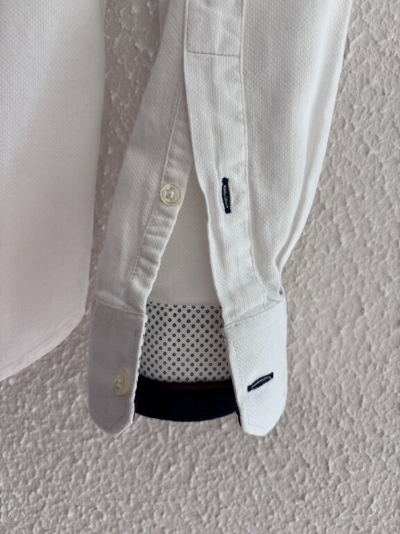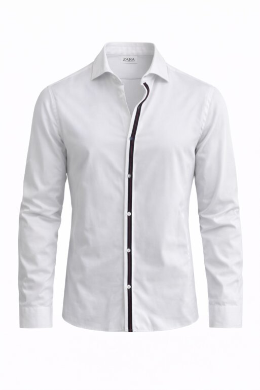 Camisa Zara Man Premium en Perfecto Estado en color blanco con detalles en contraste en el interior del cuello y a lo largo de la botonadura en tonos azul marino y burdeos. Corte moderno, tela suave y ligera, ideal para looks arreglados sin esfuerzo.