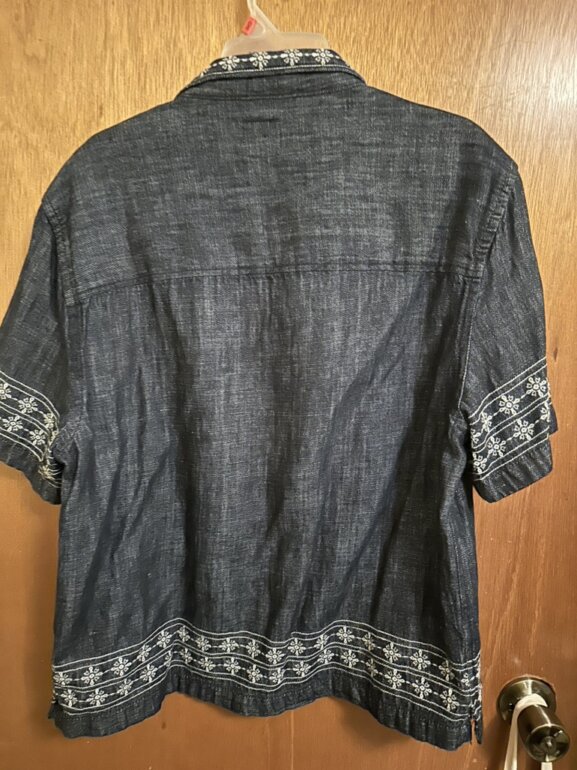 Camisa denim Marc’s Zara talla S, queda como M por el corte amplio y recto con botados en el cuello y la línea de botones, la tela tiene un acabado brilloso único que resalta cada detalle