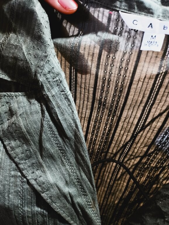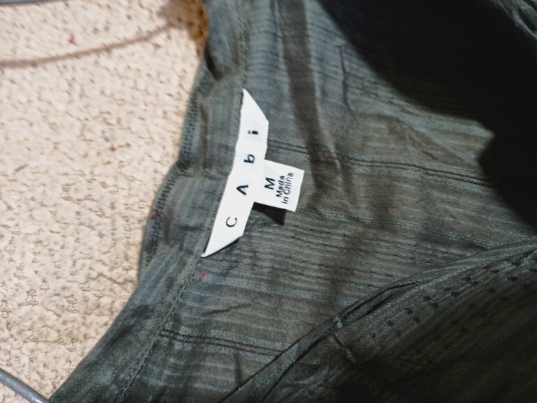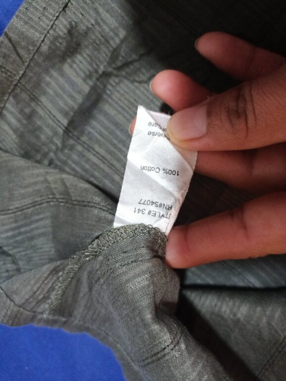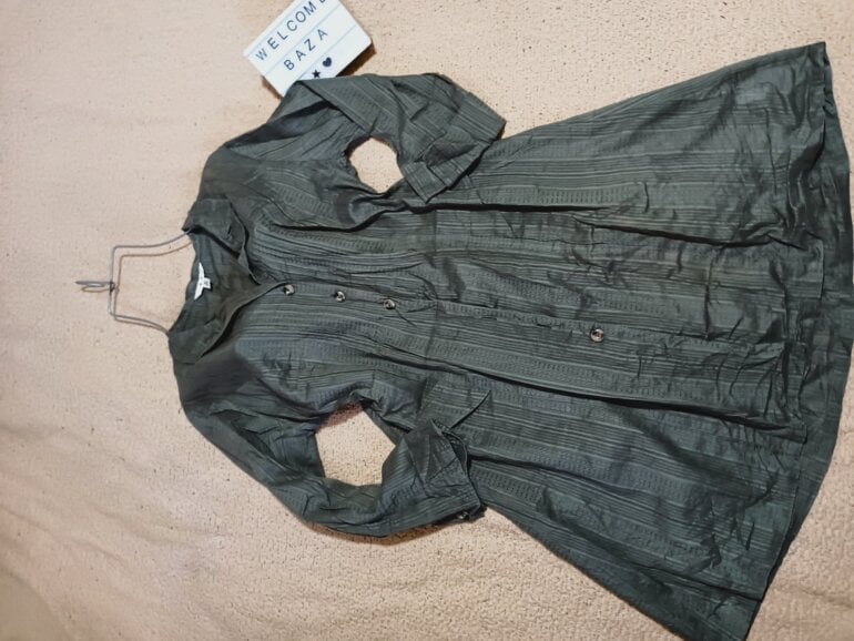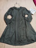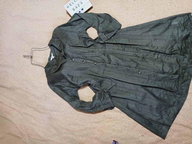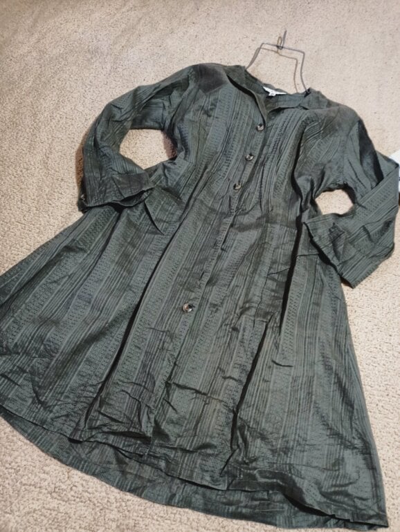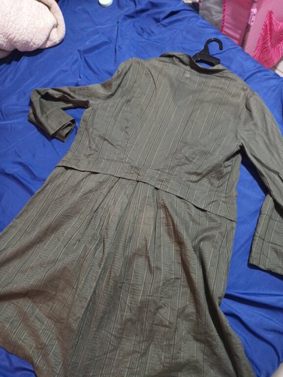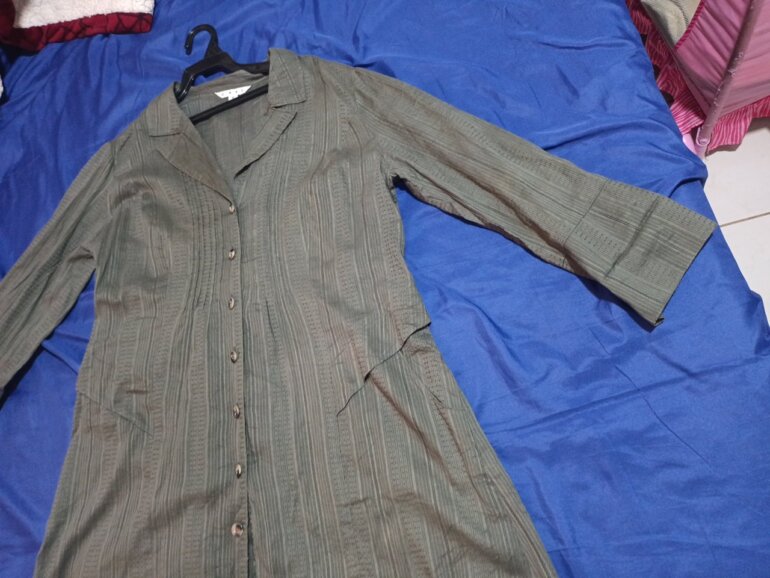Vestido camisero largo de manga larga, posiblemente un abaya o caftán, en color gris o verde olivo con un patrón de rayas