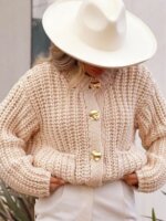 Cárdigan de punto, color beige con botones dorados. Talla M. Diseño oversize. Medidas: Hombros: 52 cm. Sisa a sisa: 52 cm. Largo: 50 cm. Nuevo. No tiene detalles.
