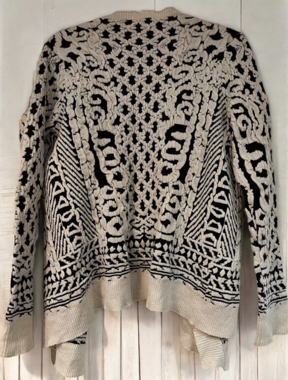Beige , negro, con hilo dorado , padrísimo, diseño, manga larga, tejido grueso y caliente, queda a S/M