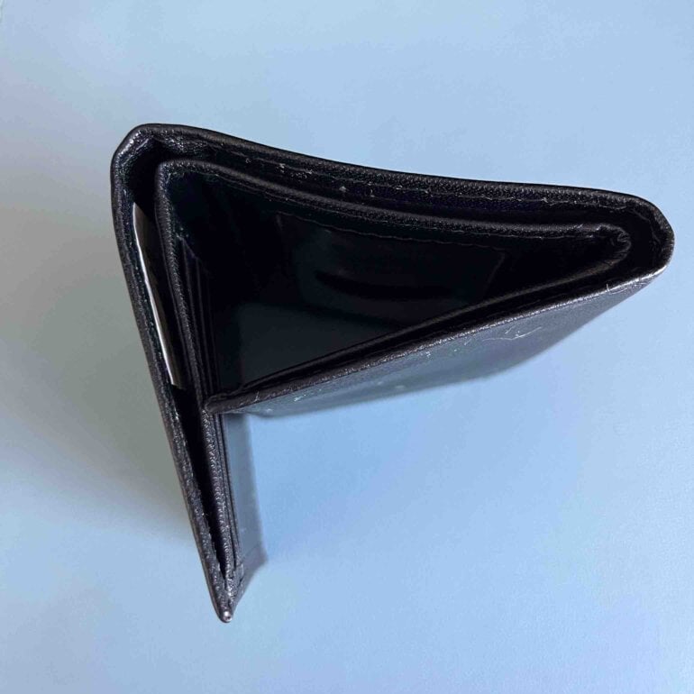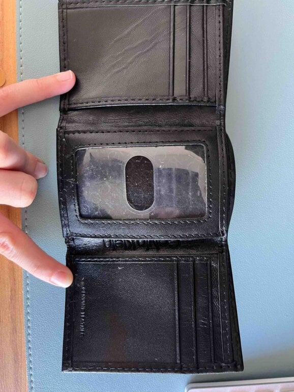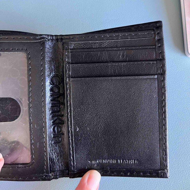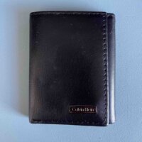 Cartera negra marca Calvin Klein, tiene espacio para billetes y tarjetas. Compacta se dobla en 3