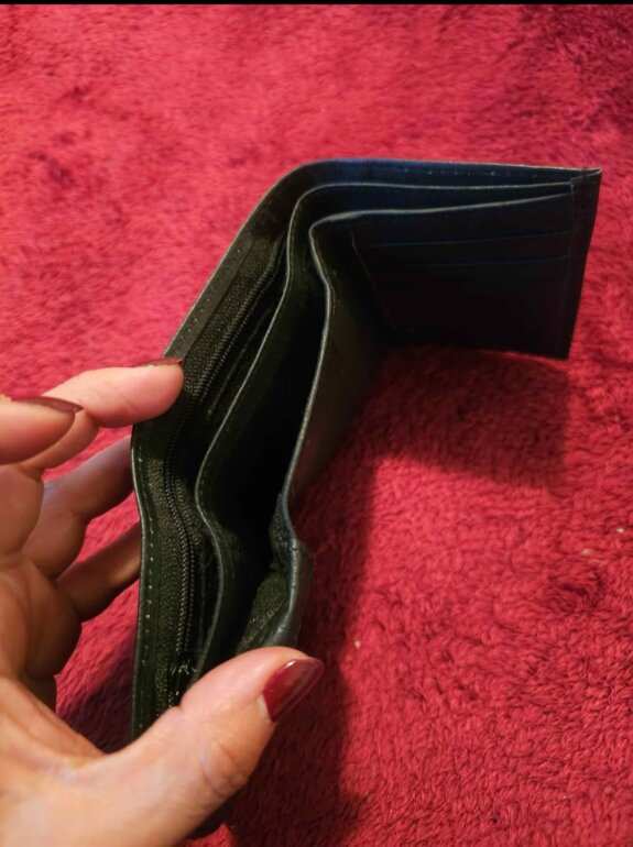 Cartera de piel color negro. Ideal para billetes, monedas y tarjetas.