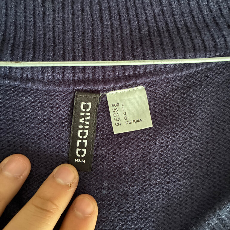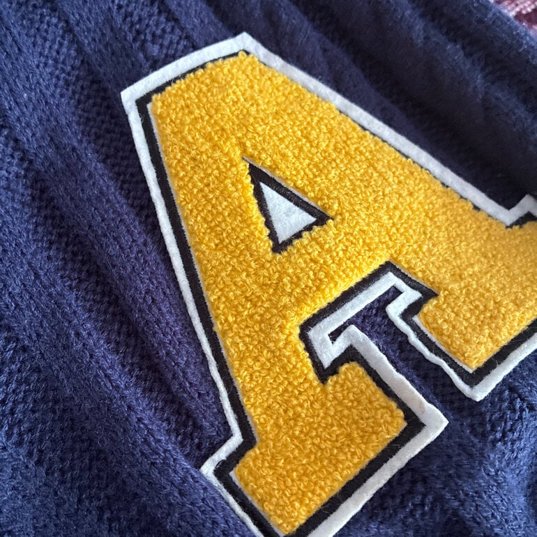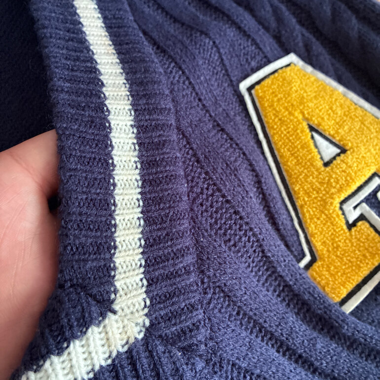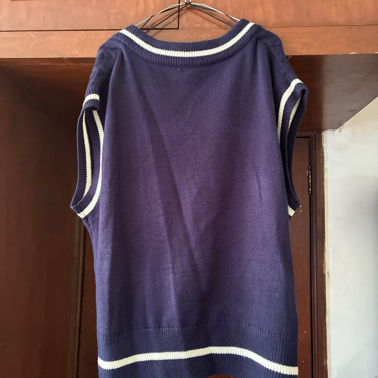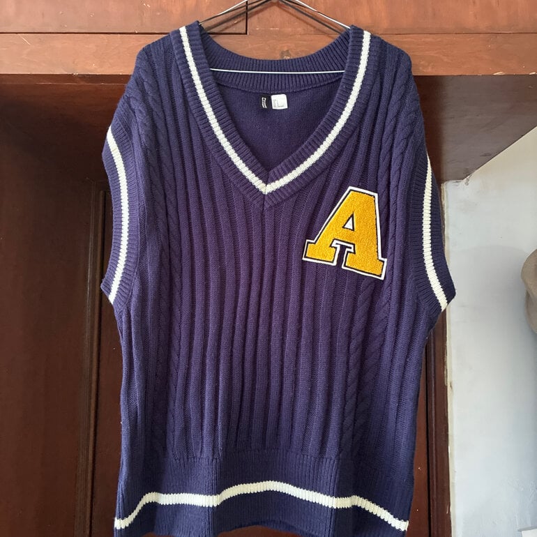 Chaleco azul marino con líneas blancas tipo universidad queda un poco grande a la talla