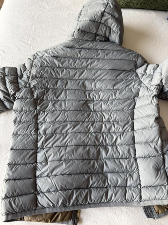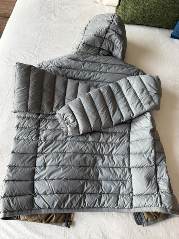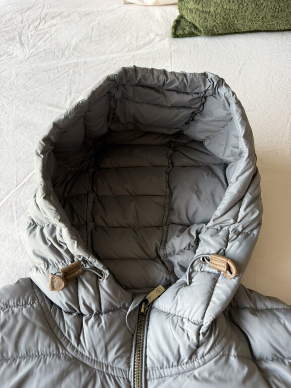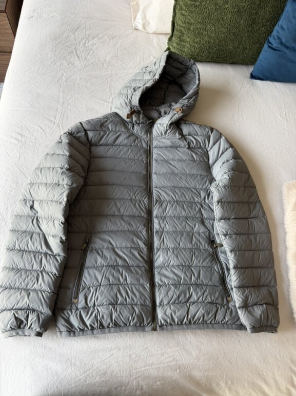 Chamarra acolchada color gris con gorro. Muy ligera pero abrigadora, ideal para clima frío. Cierre frontal y bolsillos con cierre. En muy buen estado, sin manchas ni detalles visibles. Perfecta para uso diario.