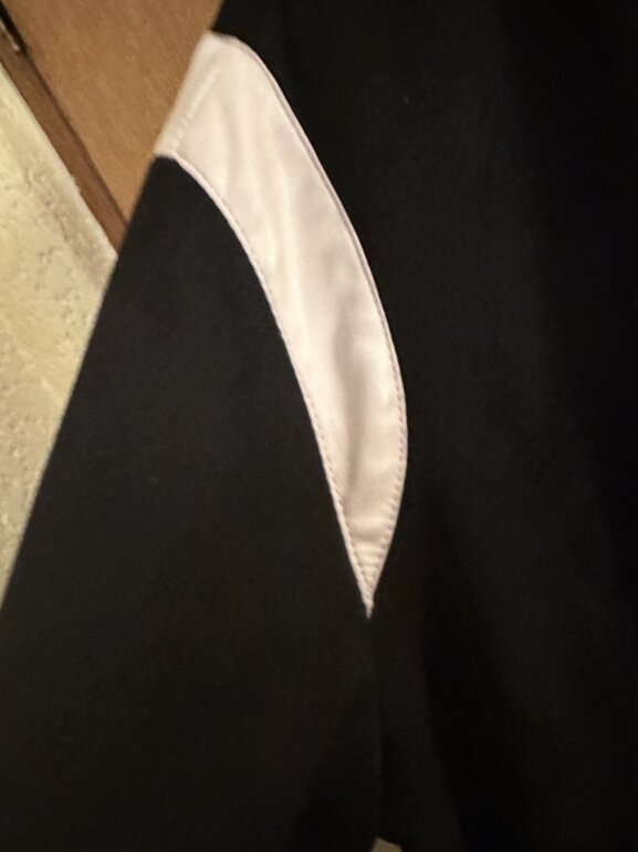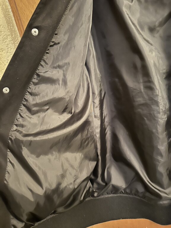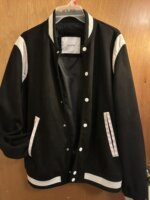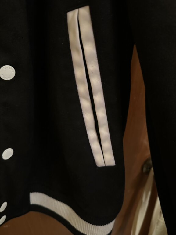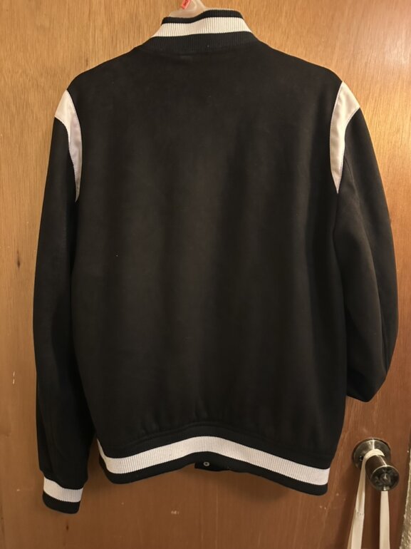 Chamarra negra tipo terciopelo look american football cómoda ligera fácil de transportar tamaño mediano con detalles blancos en mangas cintas bolsas hombros y cuello, juvenil y con mucho estilo para un outfit relajado pero con clase