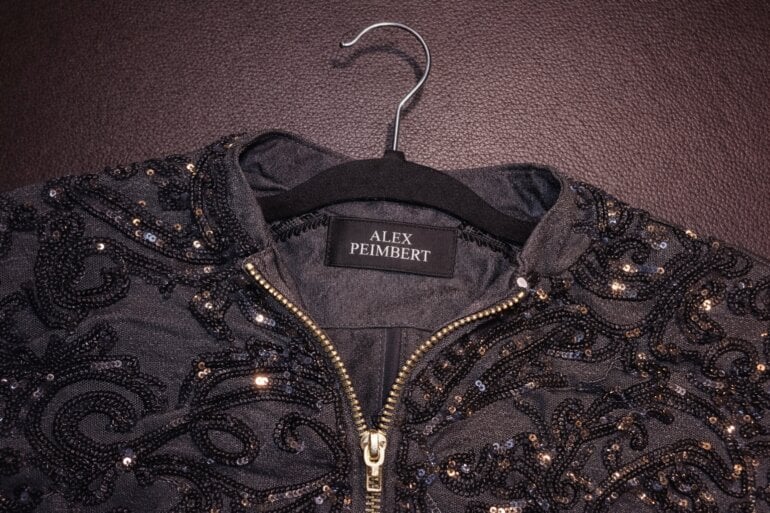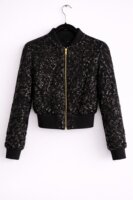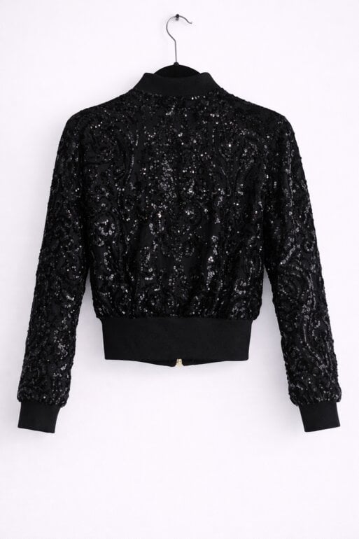 Espectacular chamarra tipo bomber en color negro con aplicación de lentejuelas brillantes. Diseño moderno con cierre frontal dorado y puños elásticos. Ideal para eventos, fiestas o para elevar cualquier outfit básico.