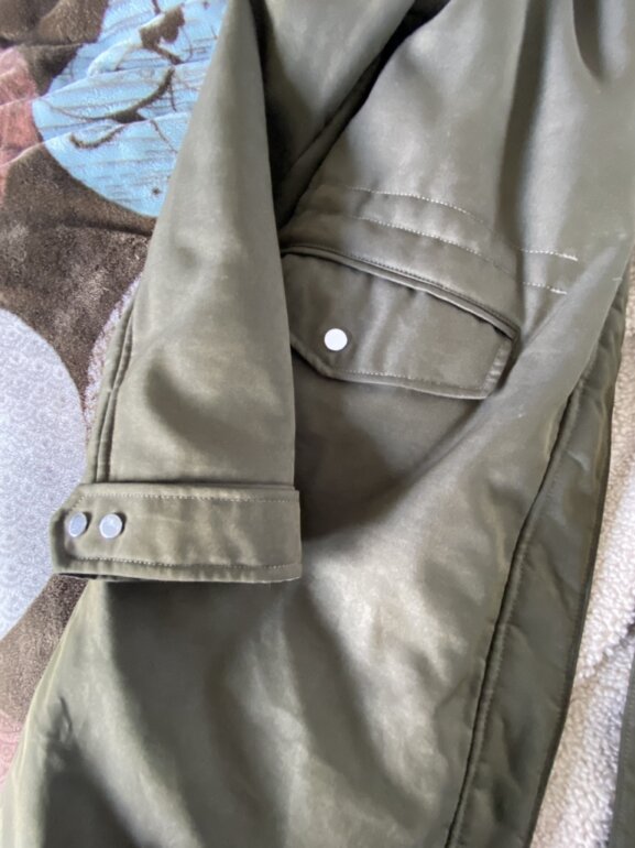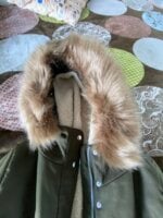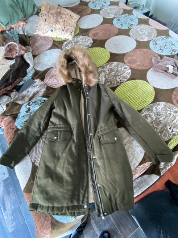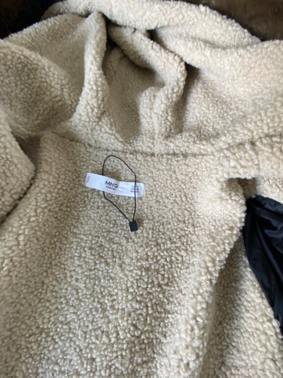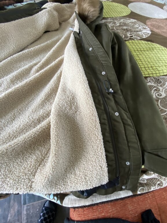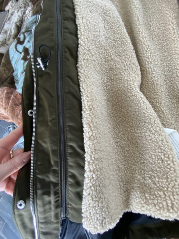 Nueva. Tiene un forro tipo borrego color camel que es removible. Peluche fino en el gorro, no es removible el gorro. Queda abajo de la cadera. Fiel a su talla xs.
