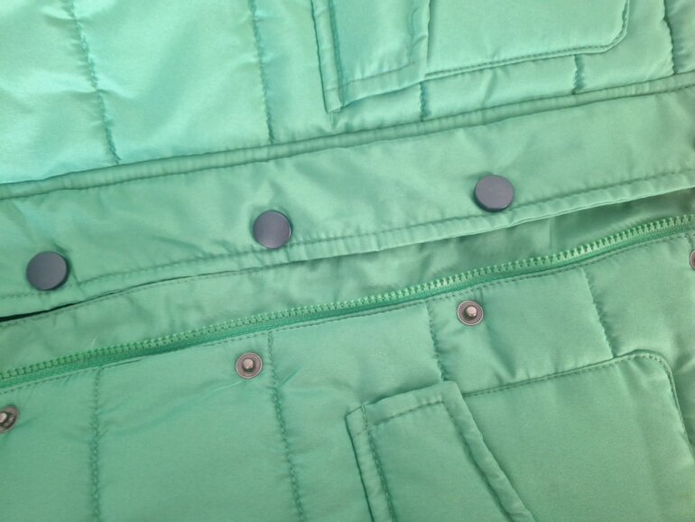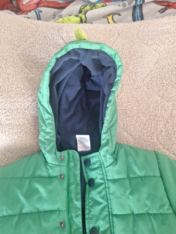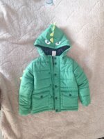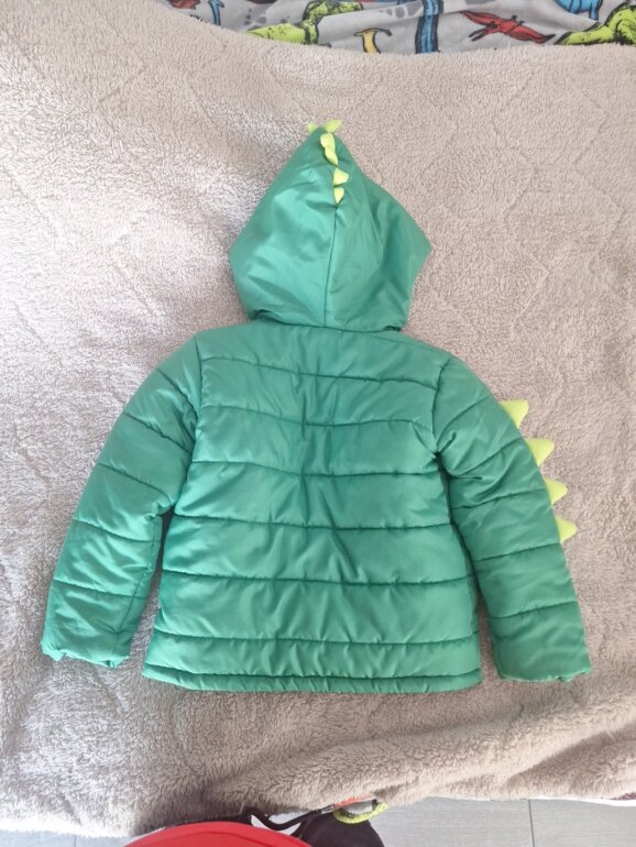Chamarra verde brillante con diseño de cocodrilo en la gorra y el brazo, es para niños de 4 años, queda debajo de la cintura, tiene cierre y botones.