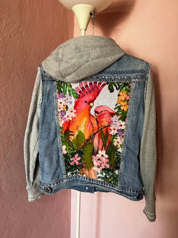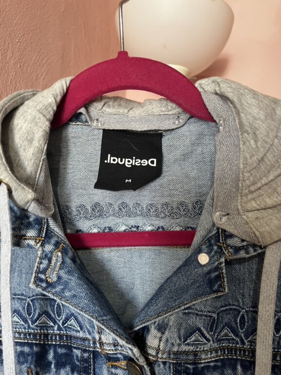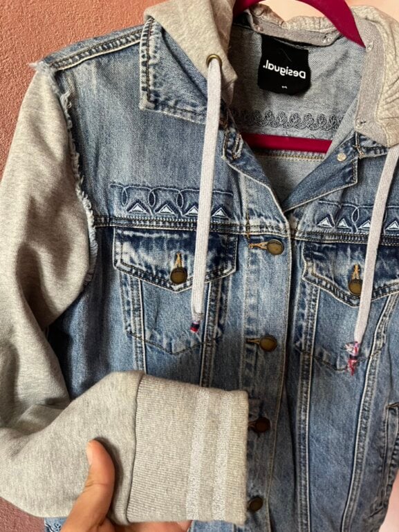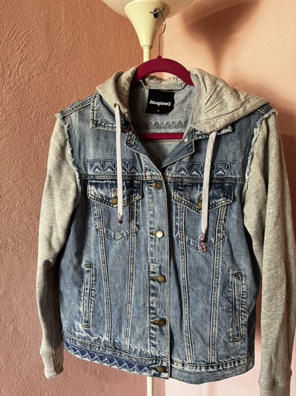 Chamarra de mezclilla marca Desigual, con gorro que se puede quitar y poner, espalda con dibujos de pericos coloridos, en buen estado