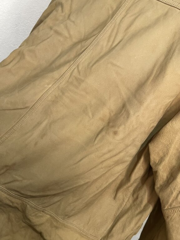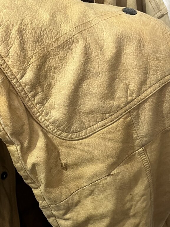 Tiene desgaste en algunas partes de la prenda y algunas manchitas, no cuenta con ningún tipo de rotura