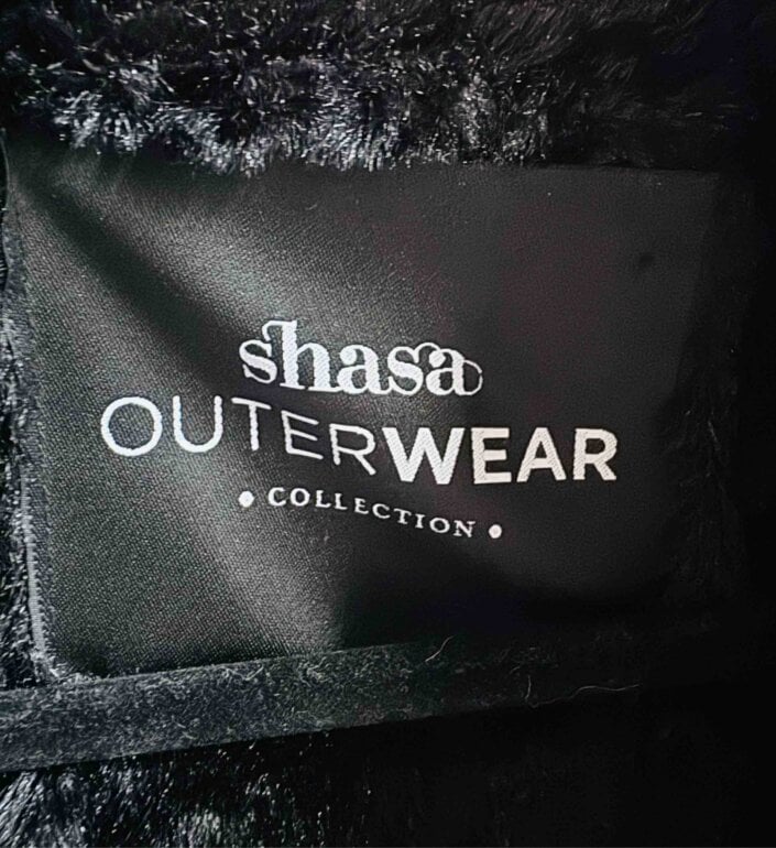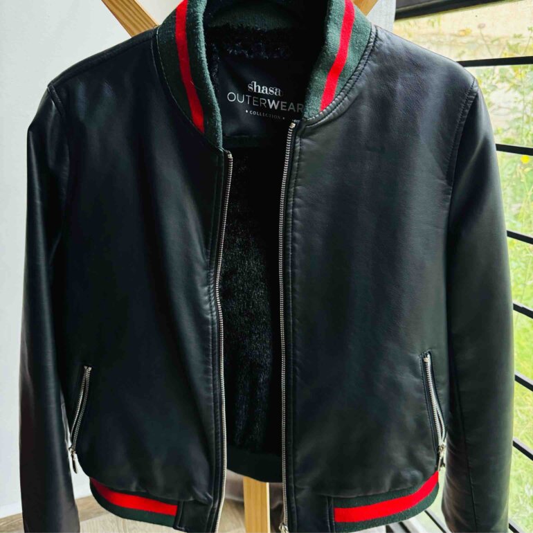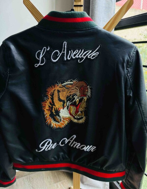 Chamarra de piel negra con estampado trasero de un tigre, por dentro está afelpada con peluche negro, marca Shasa talla Chica, es fiel a la talla