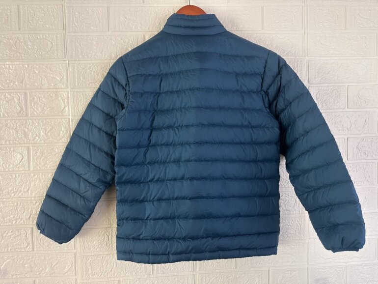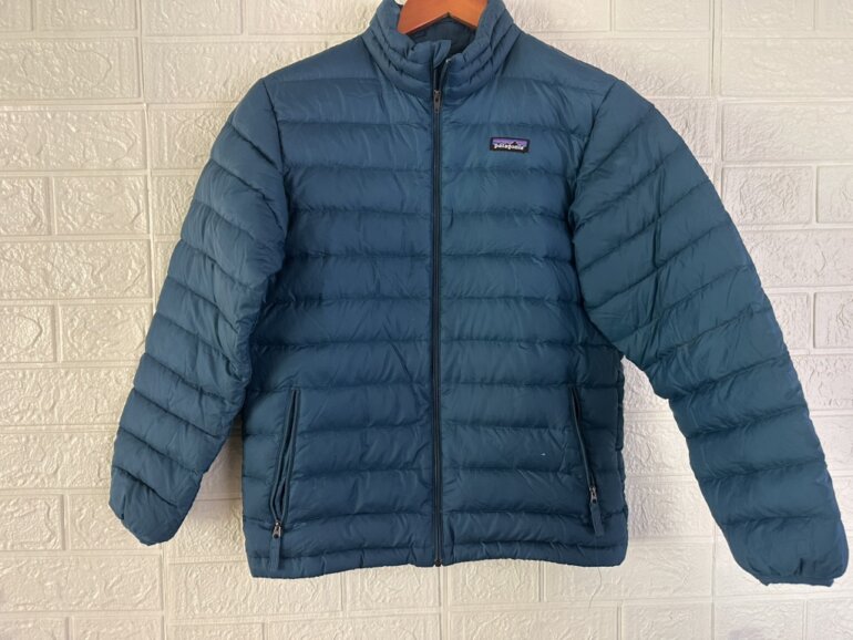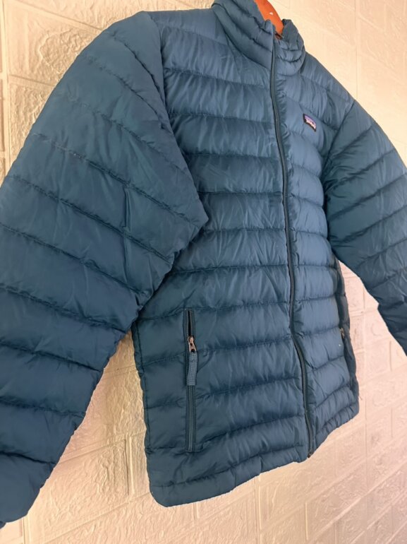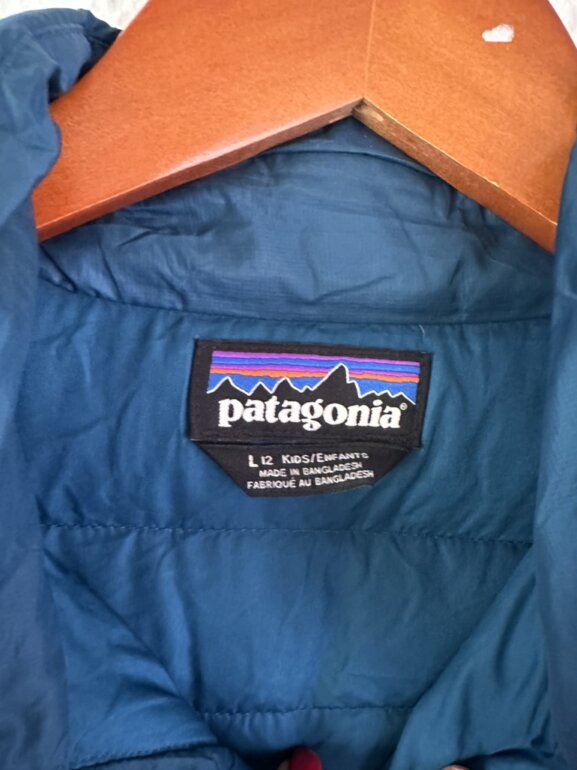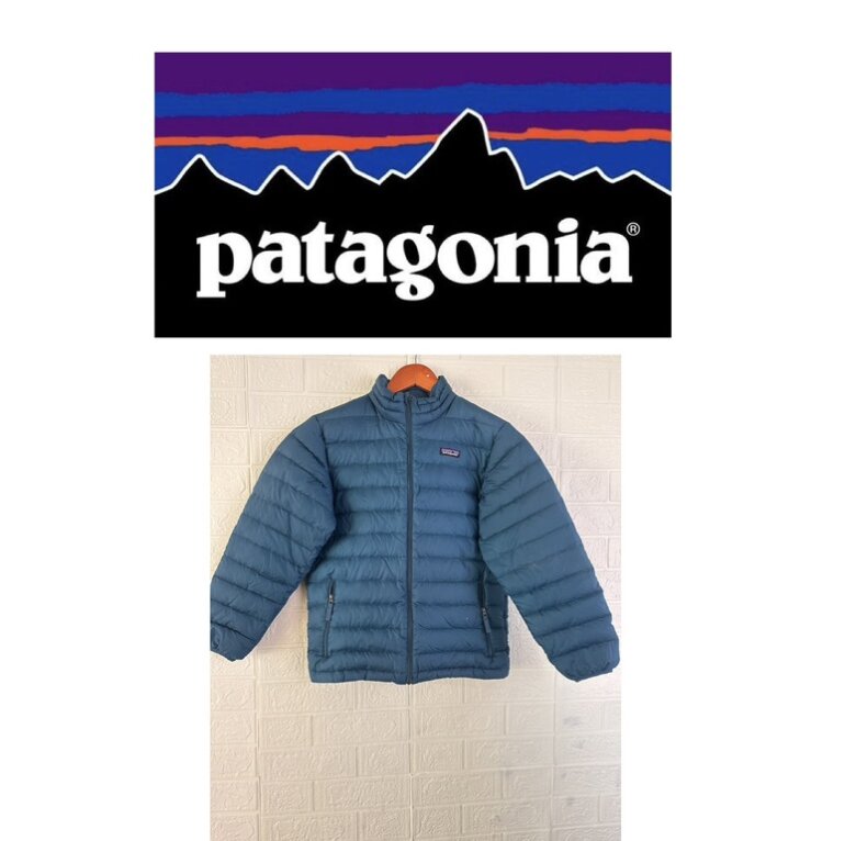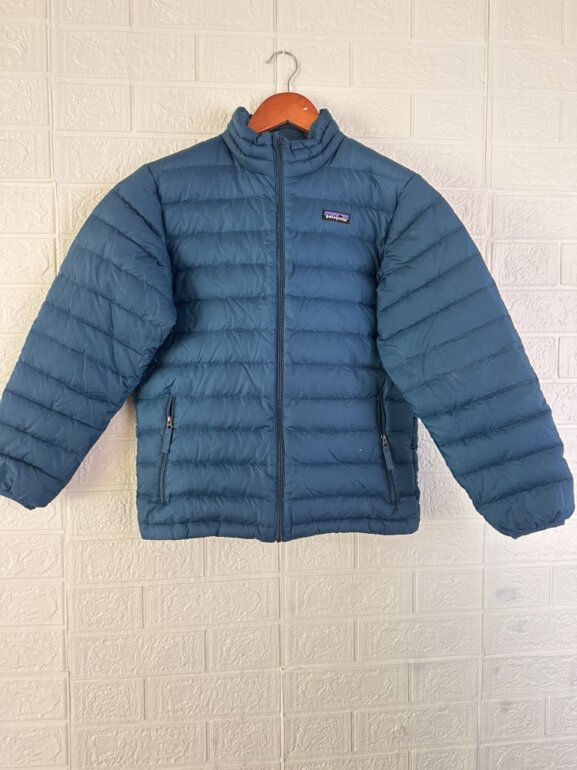La chaqueta es un modelo Down Sweater Jacket de Patagonia en color azul celeste.Es una prenda aislante, ligera de plumas y cortaviento, diseñada para ser utilizada en diversas circunstancias, desde actividades al aire libre hasta uso urbano. Talla L niño (12-13)detalles dentro de una bolsa está roto no afecta su uso ya que es por dentro