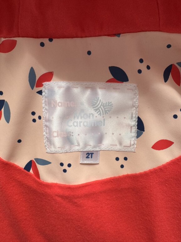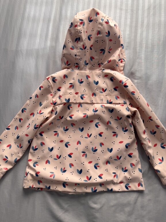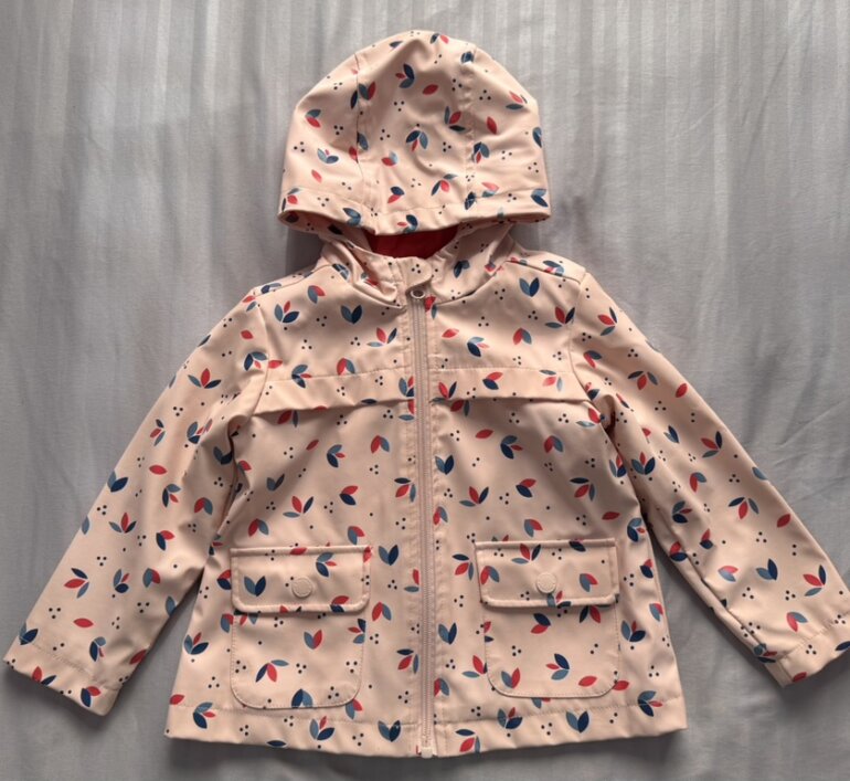 Chamarra impermeable color rosa claro con figuritas Rosa y azul, con gorrito y bolsas delanteras. Forro calientito. Talla 2 años. Marca mon caramel.