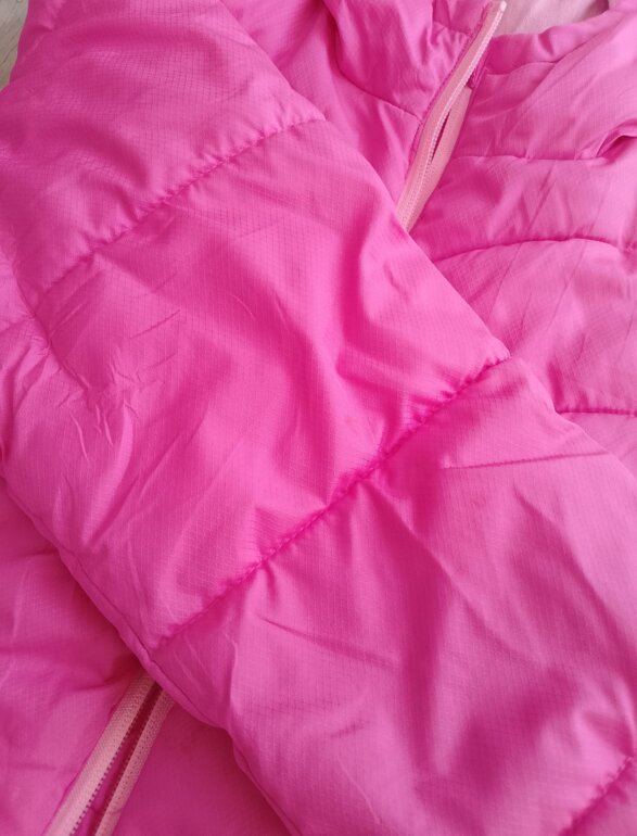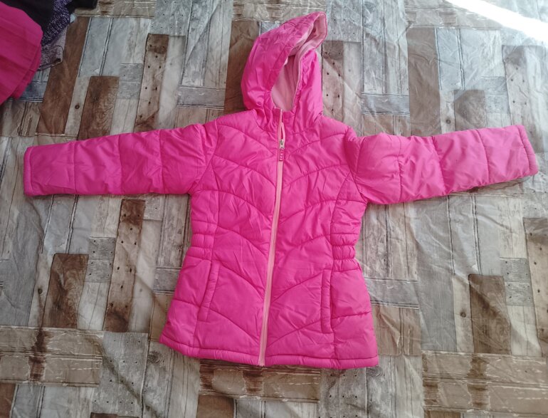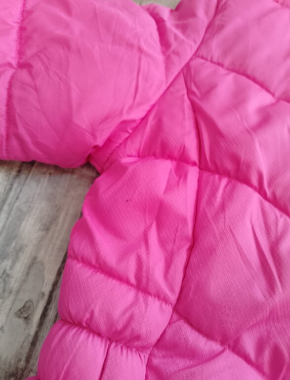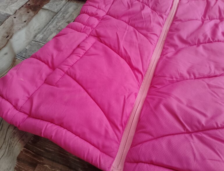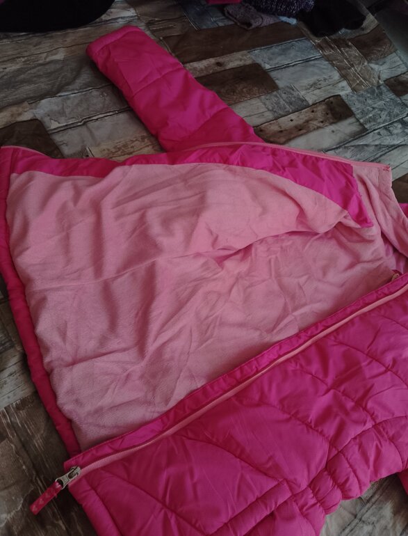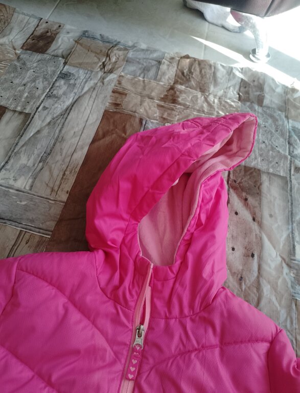 Chamarra es de tela polar por dentro y de fuera es acolchonada ,solo tiene pequeños detalles como de suciedad pero no afecta su uso cuenta con su gorro