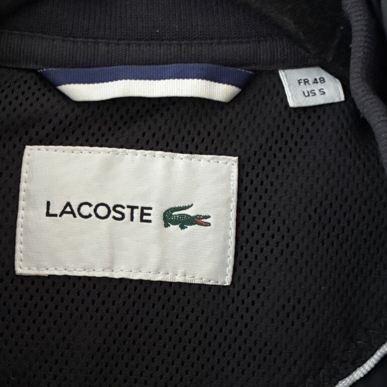 Chamarra Lacoste con forro y cuello, color negro, ligera y moderna, además súper calientita, talla S/chica, se abrocha con botones, ideal para vestimenta casual, precio original $5,500