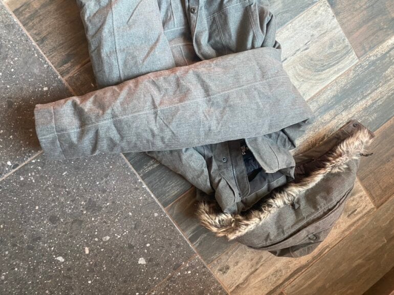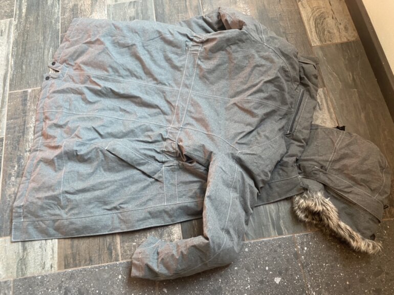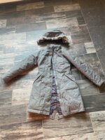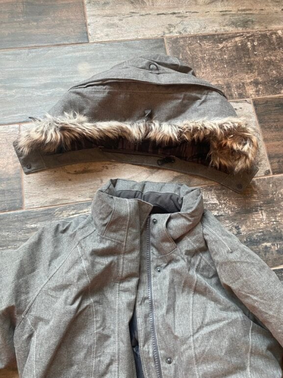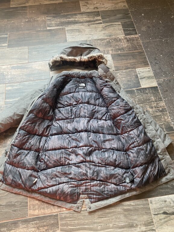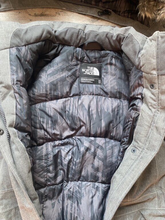 Chamarra S-Xs pluma de ganso. Calidad suprema. Solo se uso en un viaje y costo el doble. Gorro desprendible. GRIS mas oscuro que como se ve en fotos.(jaspeado)