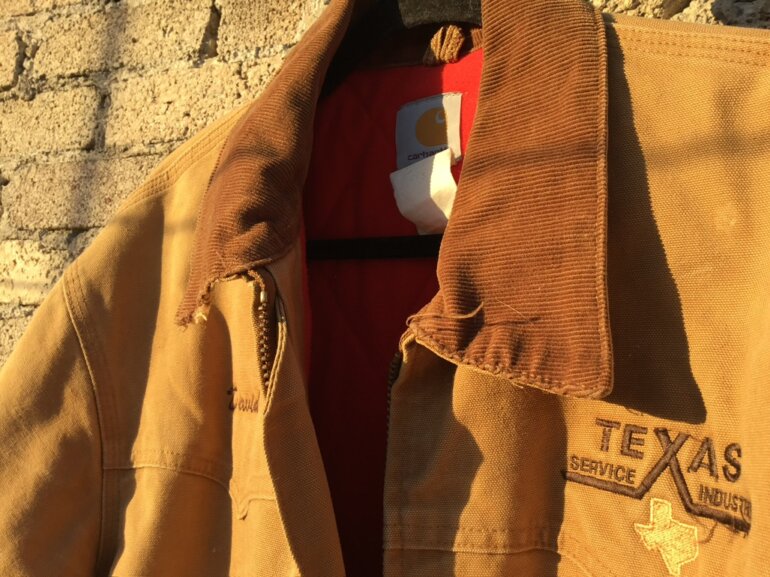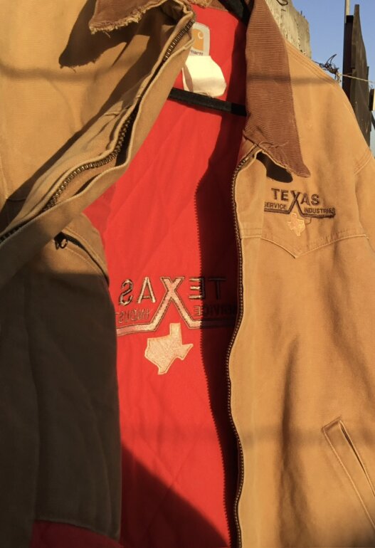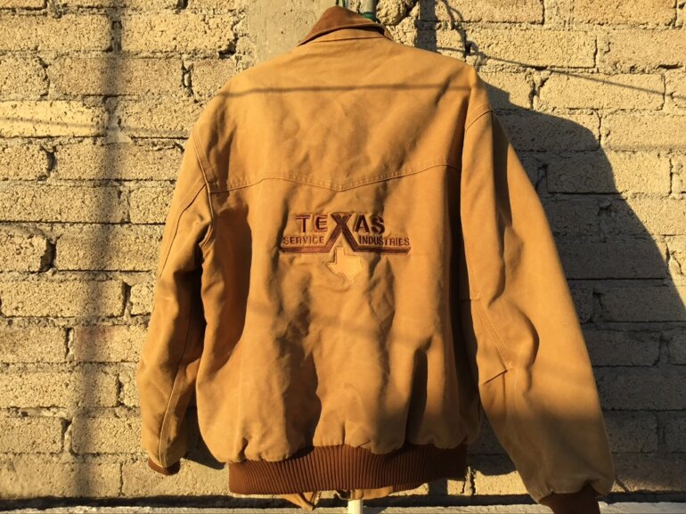 Chamarra de lona pesada con fade. Forro interior rojo calientito, presenta una leve rotura en forro interior.