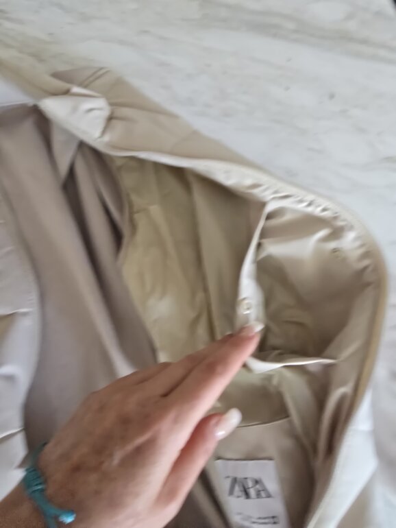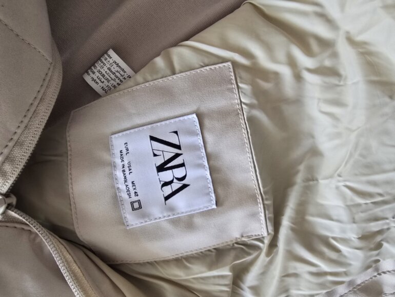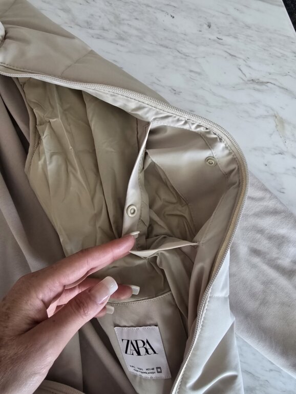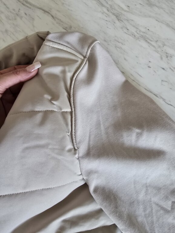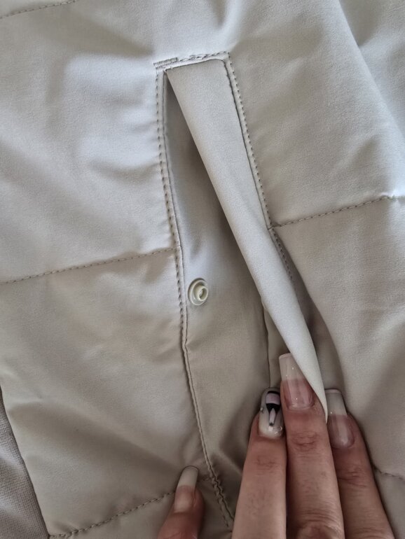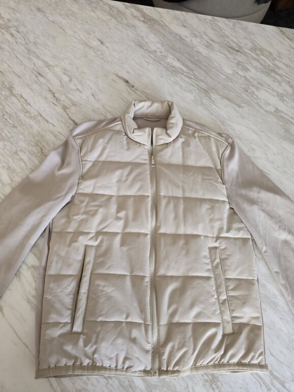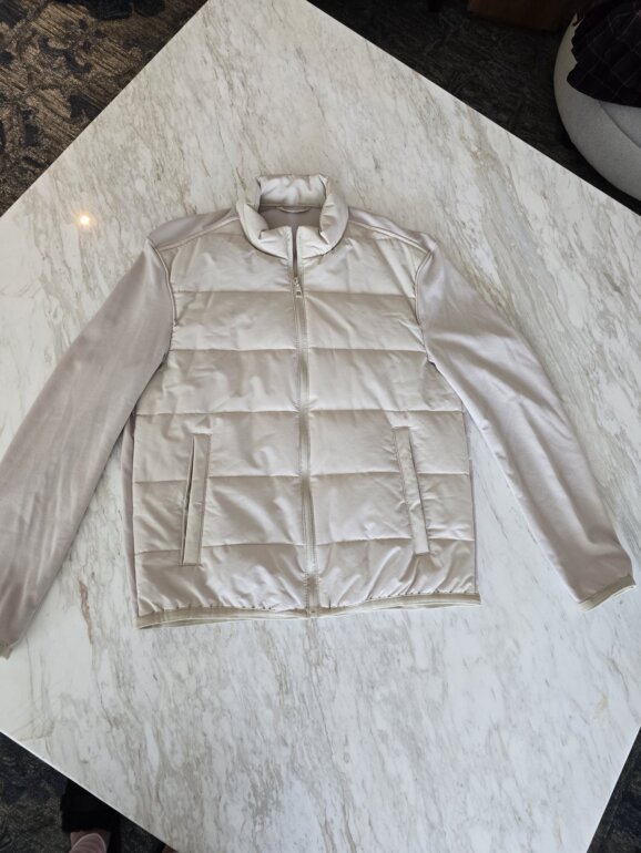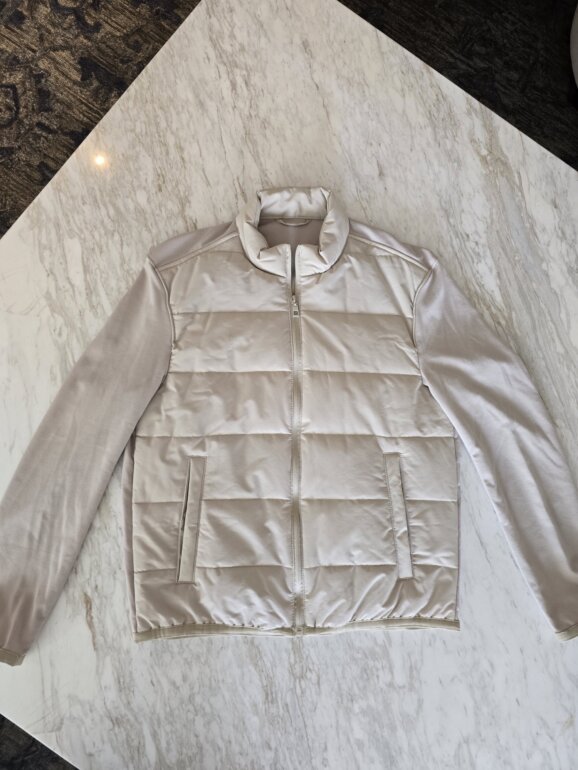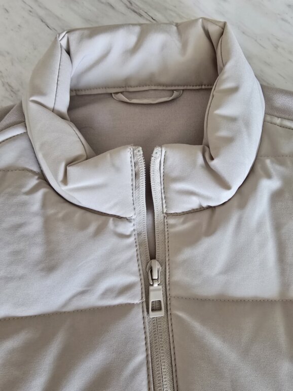 Chamarra beige claro, tipo chaleco relleno y mangas en tejido stretch con bolsa interior, lindo diseño ligero pero calientito.