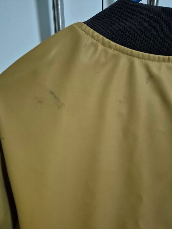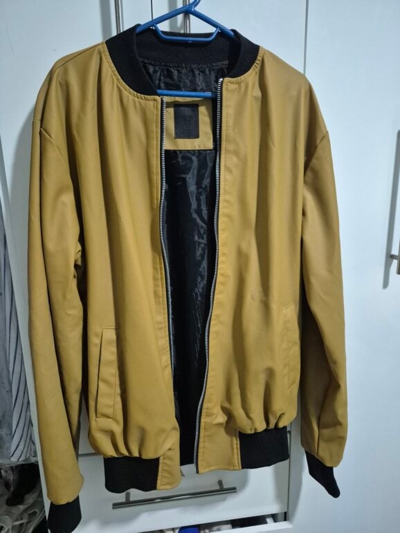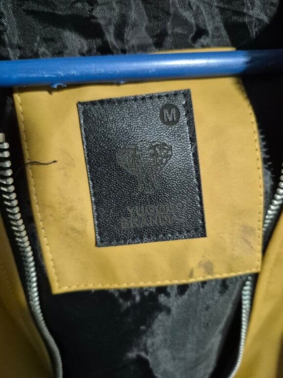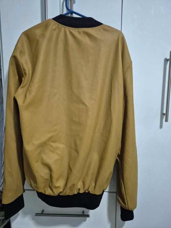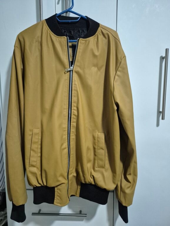 Chamarra tipo piel (sintetica) tiene una pretina negra en la parte baja. Tiene una manchita en la espalda (última foto). Es color mostaza.