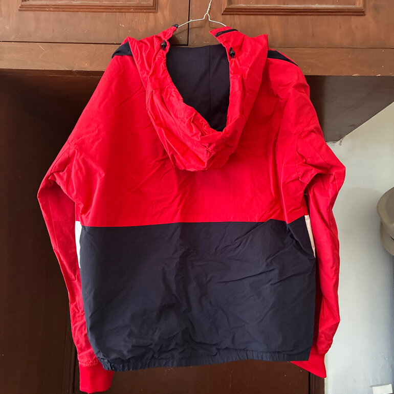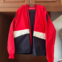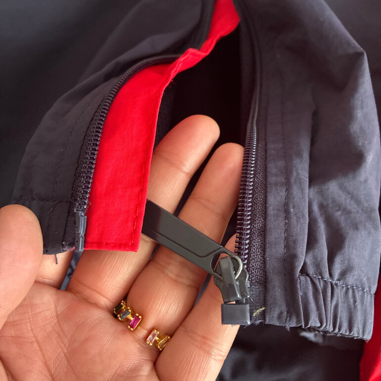 Chamarra color rojo blanco y azul tiene un pequeño ligero en el cierre que aveces cierra y aveces no, en perfecto estado