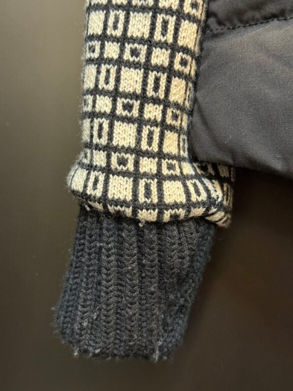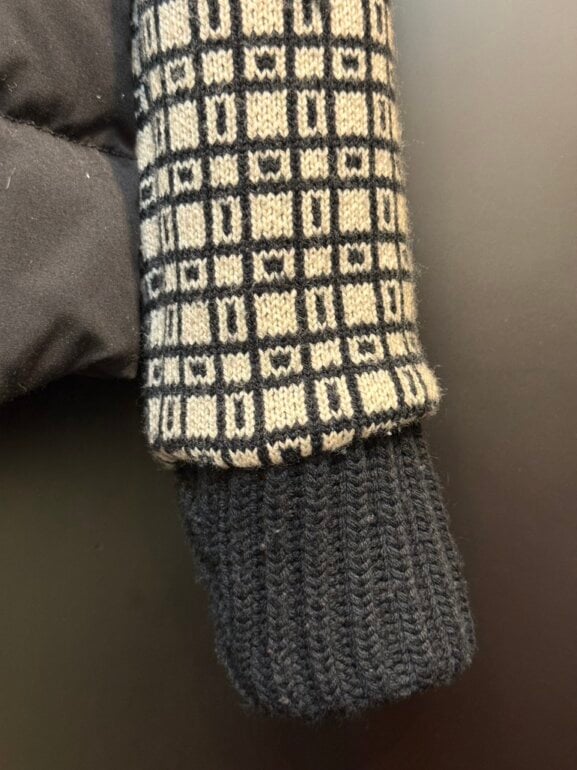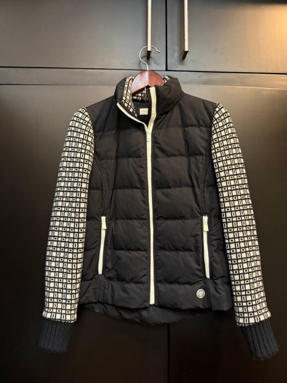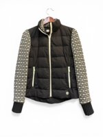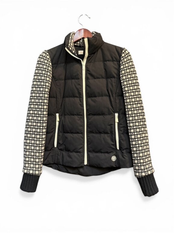 Chamarra marca tory burch, talla 4, color azul marino y con las mangas tejidas en punto.