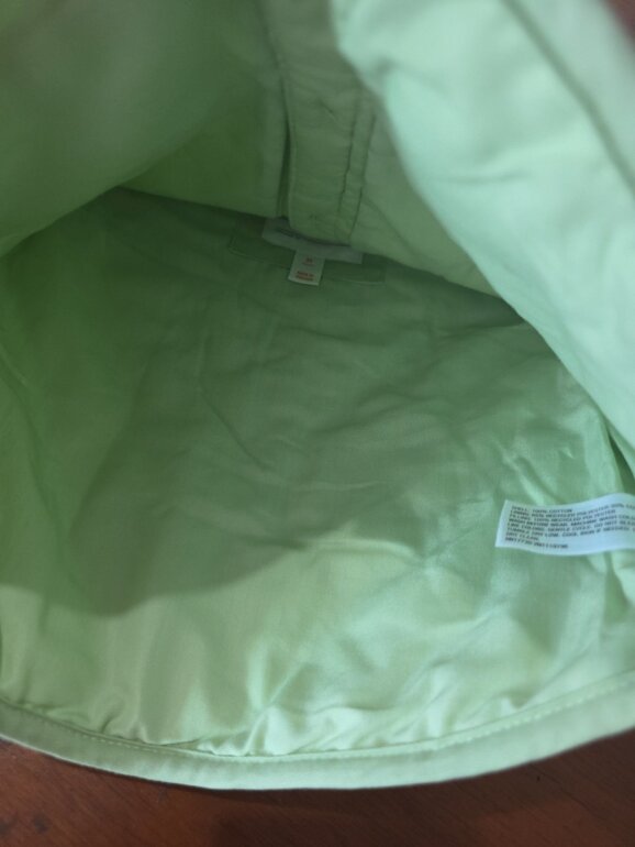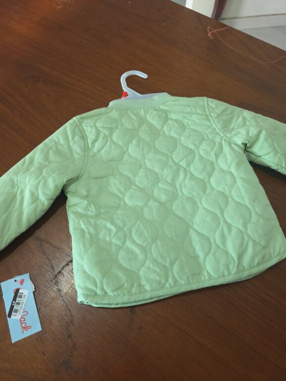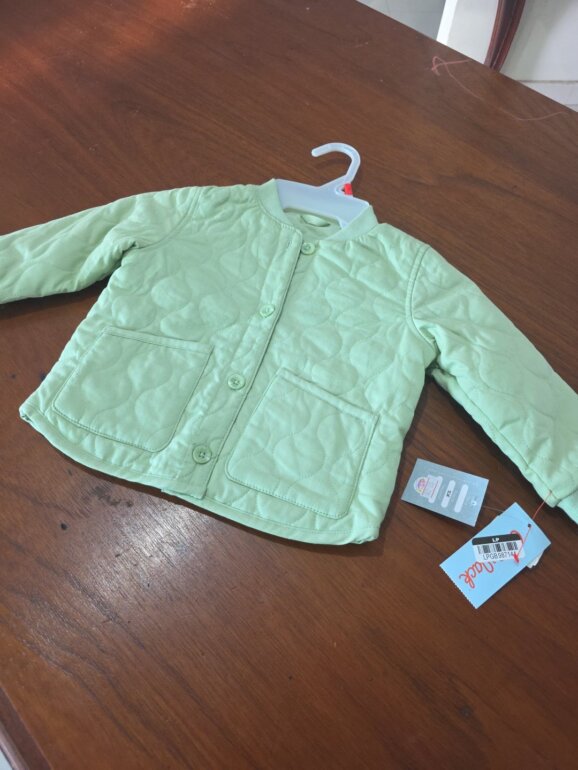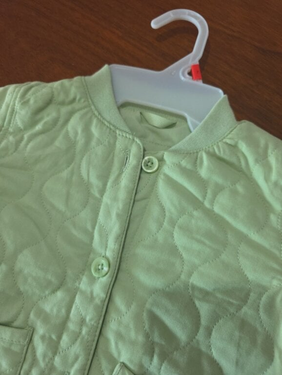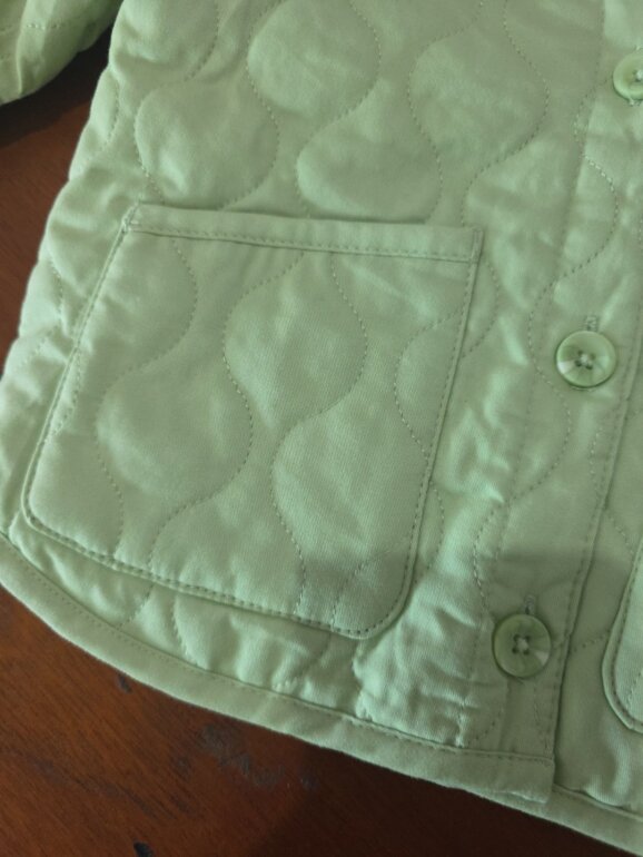 Hermosa chamarra verde pistache, gruesa pero fresca con botones en la parte de enfrente y un par de bolsas, textura con costuras. Elástico en muñecas.
