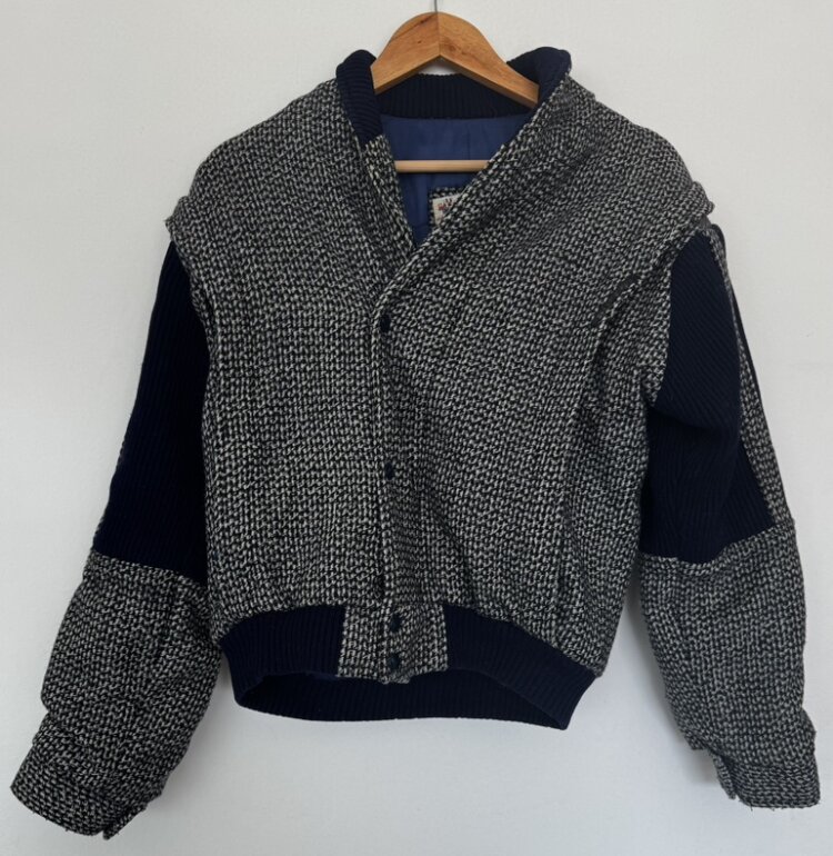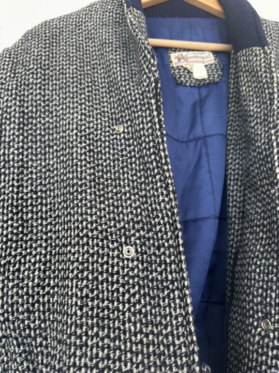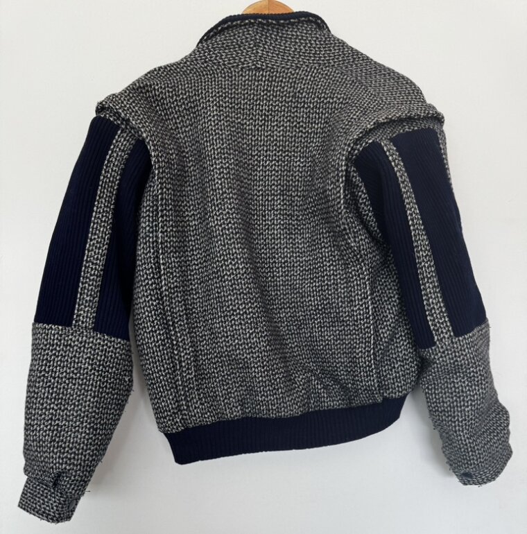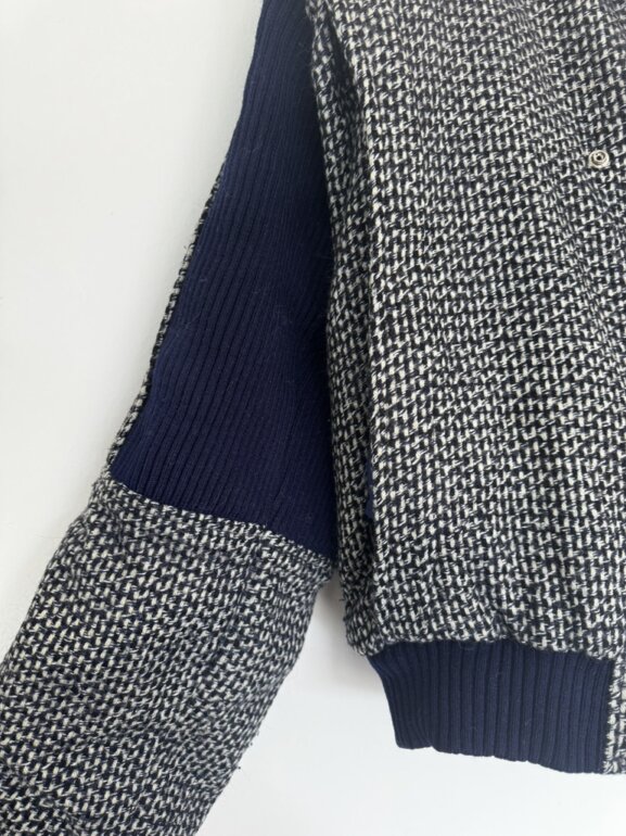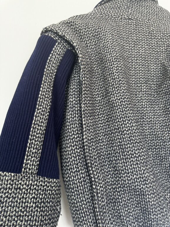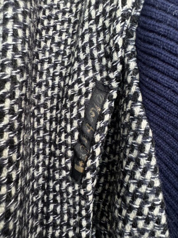 Diseño con textura tipo tweed en tonos neutros y contraste azul marino. Corte ligeramente oversized que estiliza y da un look elegante y moderno. Ideal para outfits otoñales, minimalistas o aesthetic europeo. Pieza única y atemporal. Talla M-G. Medidas: axila 56cm, hombro 51cm, largo 62.