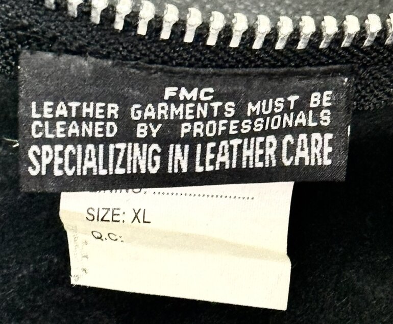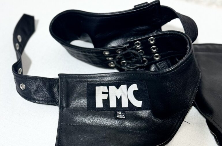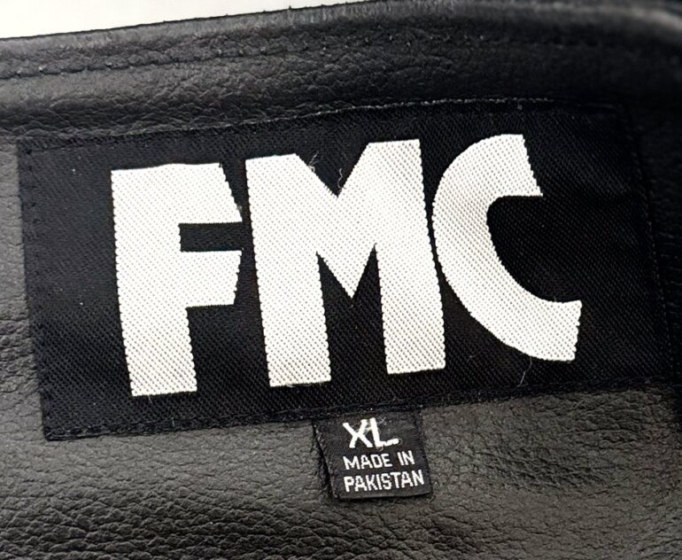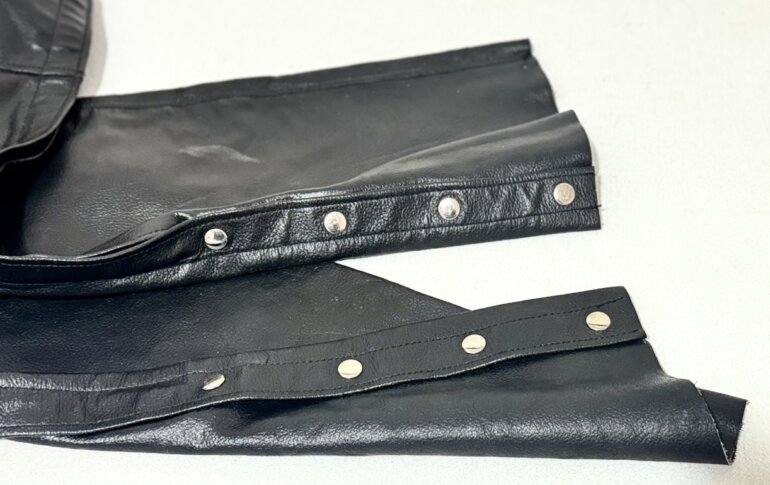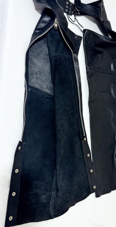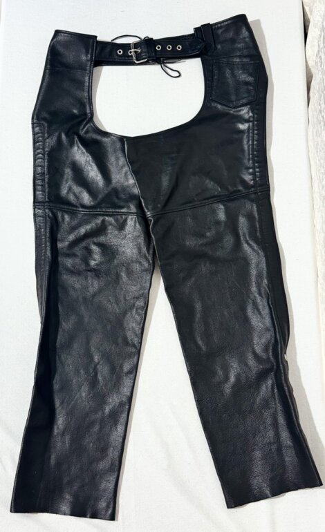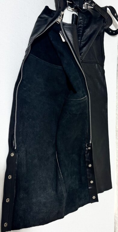Chaps de cuero negro FMC para motociclista, talla XL, cierres laterales y botones a presión en la parte baja.