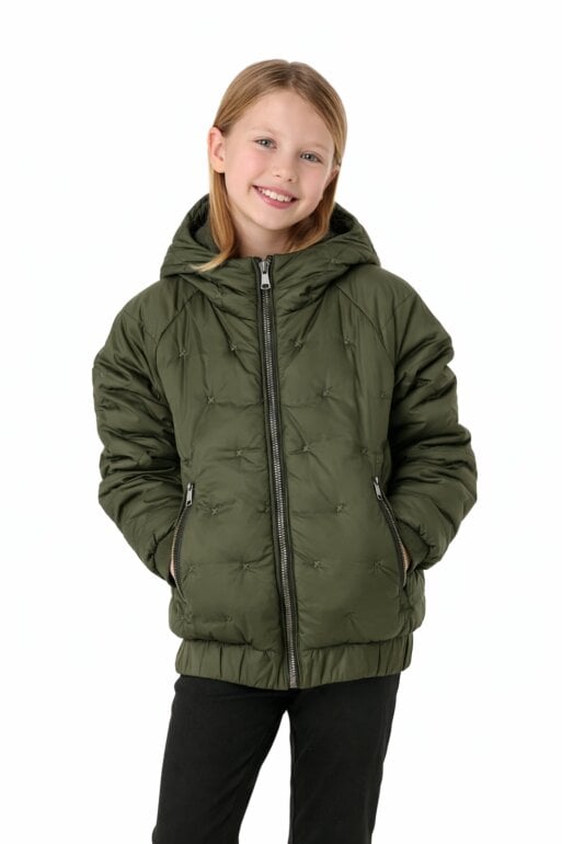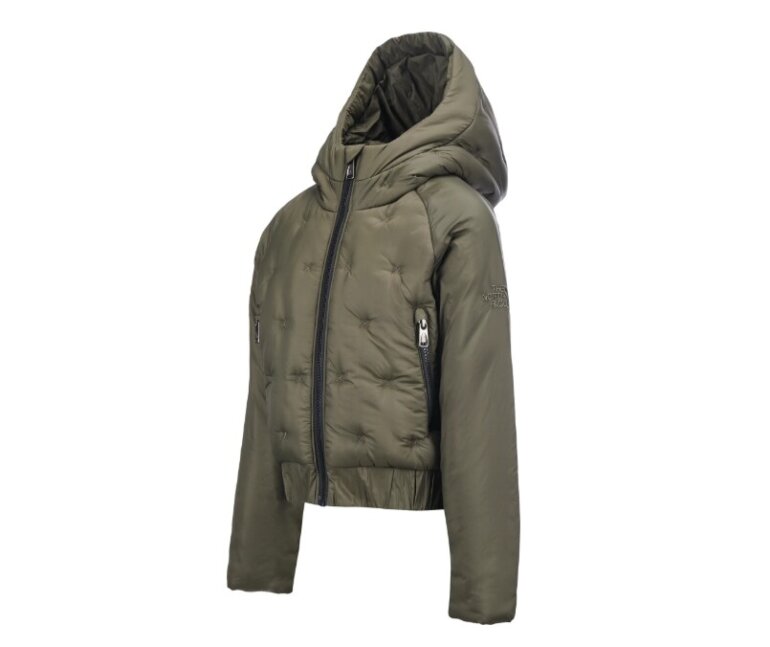 Chaqueta bomber acolchada de nailon verde oliva con capucha North Face, niños, la talla dice 10 a 12 talla M, en perfecto estado y calientita.