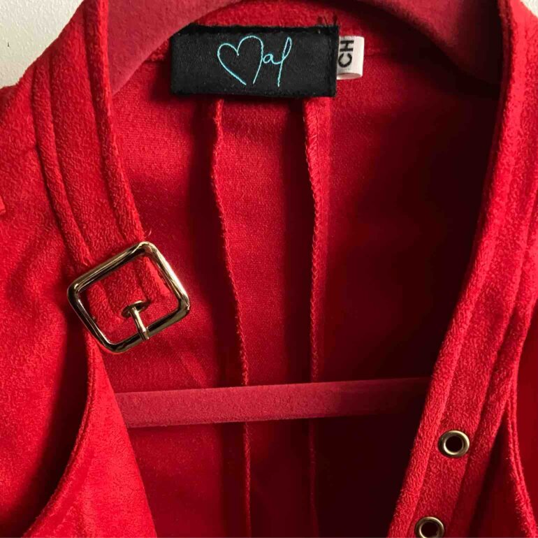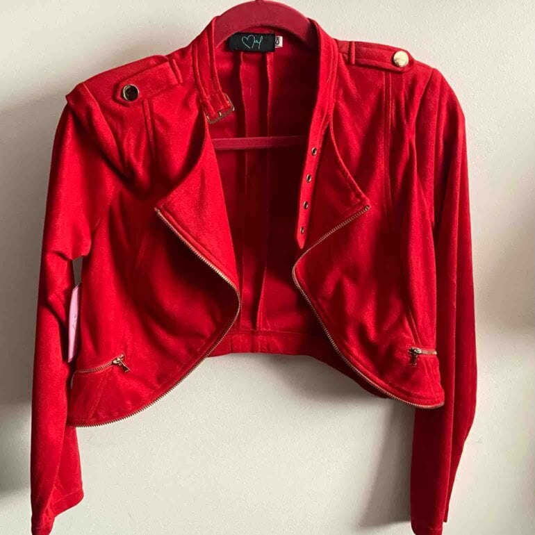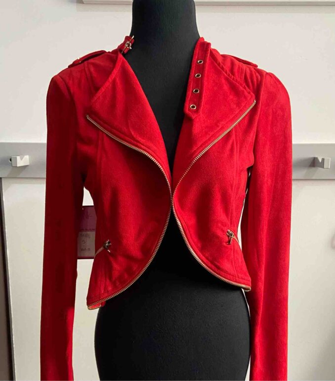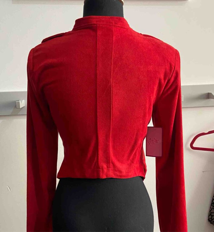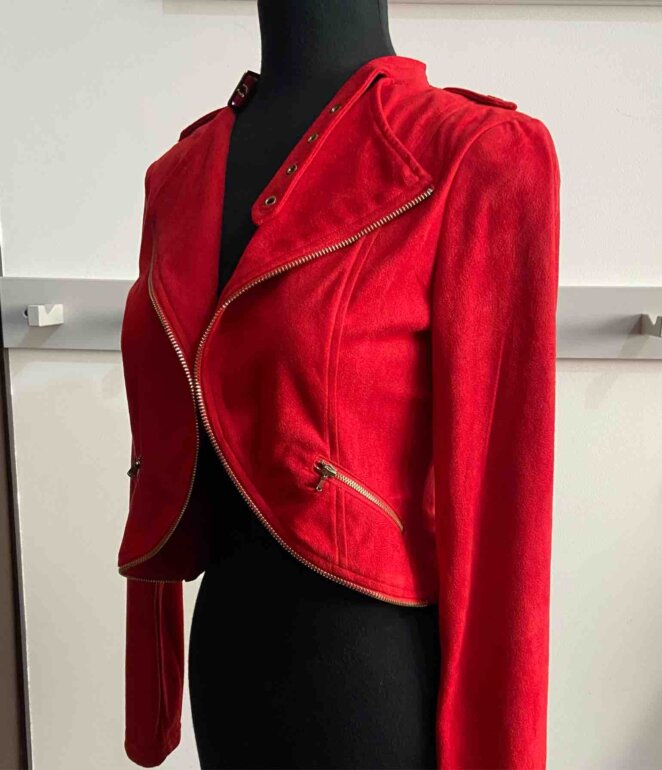 Chaqueta cortita y abierta, estilo rocker, la tela es suave, viene con un cuello que se puede dejar abierto o como shoker. Tono rojo.