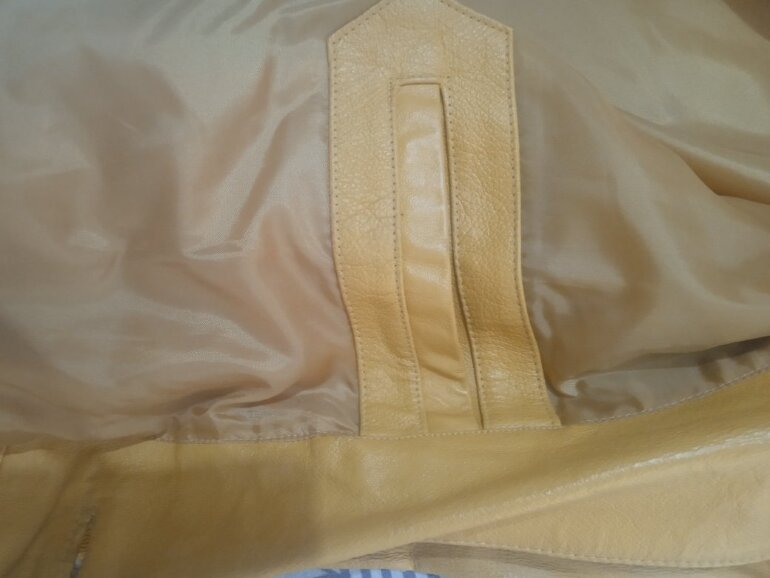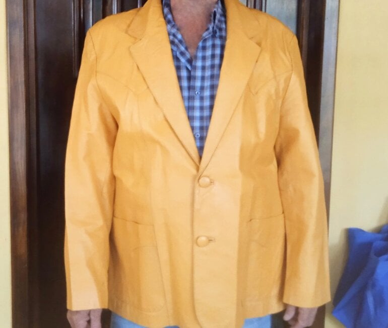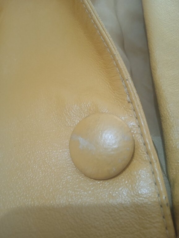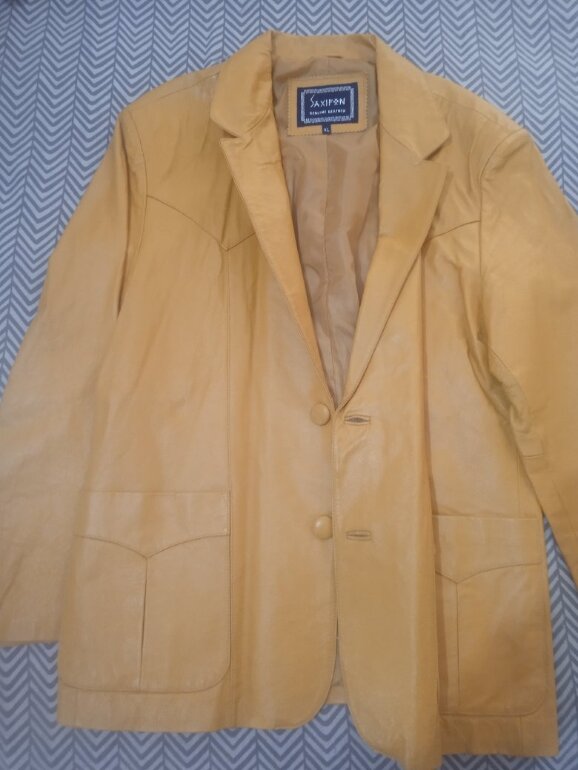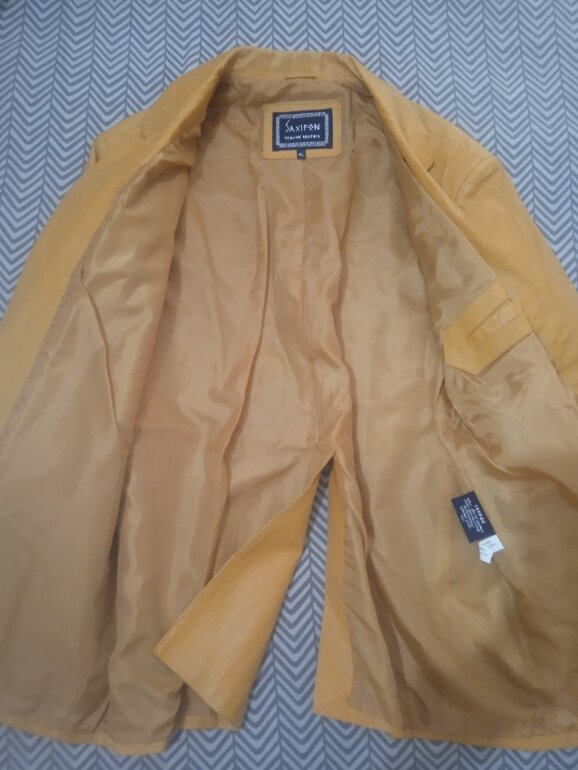 Chaqueta color mostaza, mide 60 cm de axila a axila y 78 cm de larga, tiene un poco desgastado el primer botón *última foto