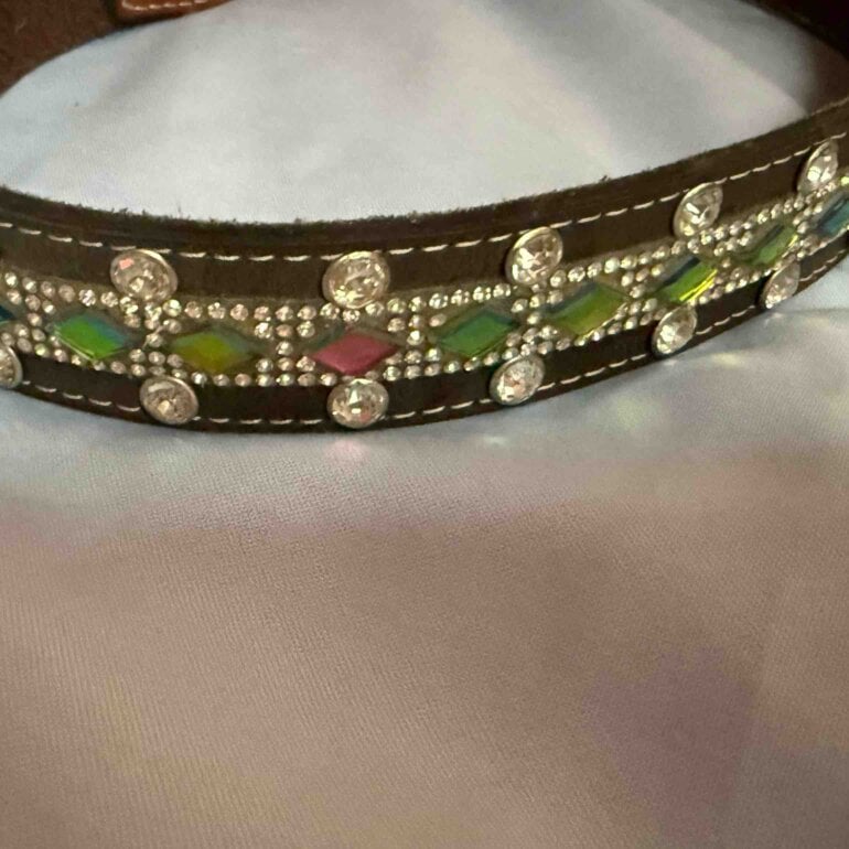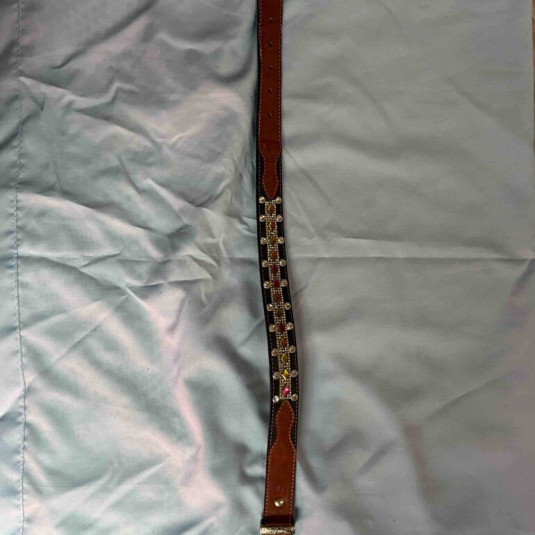 Cinturón vaquero para niña, elaborado 100% en cuero, adornado con pedrería tornasol que aporta brillo y estilo. Mide 63 cm de largo, ideal para complementar atuendos western o casuales con un toque llamativo.
