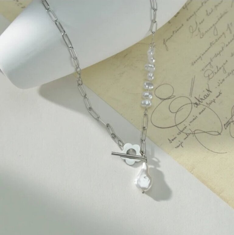 Collar plateado con perlas blancas sintéticas y flor metálica 📸Priemra imágen artículo real. 🧵Material acero de inoxidable 📏Medidas en imágenes. Mod.372311