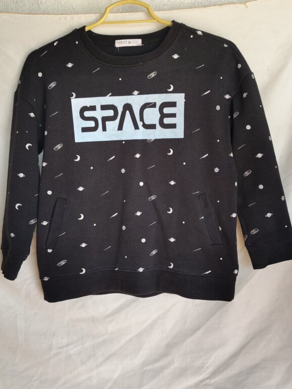 Sudadera Negra sin capucha "SPACE" marca (Next Co): El detalle es el color deslavado. Ya no es un negro intenso, tiene ese look "vivido" o vintage por las lavadas, pero la tela está entera.