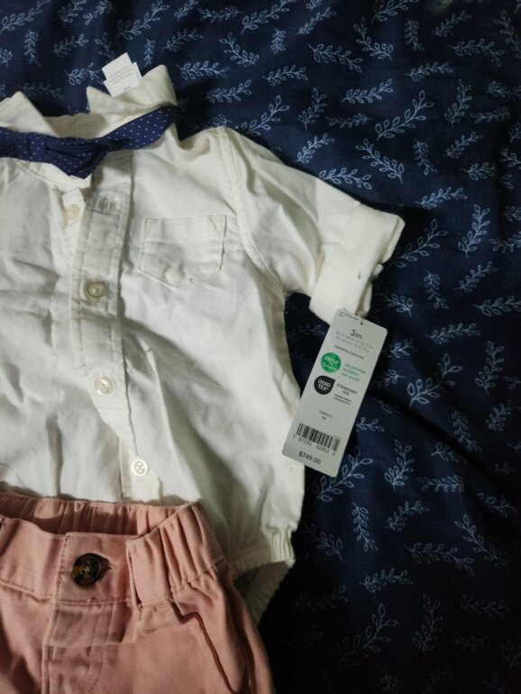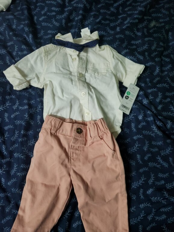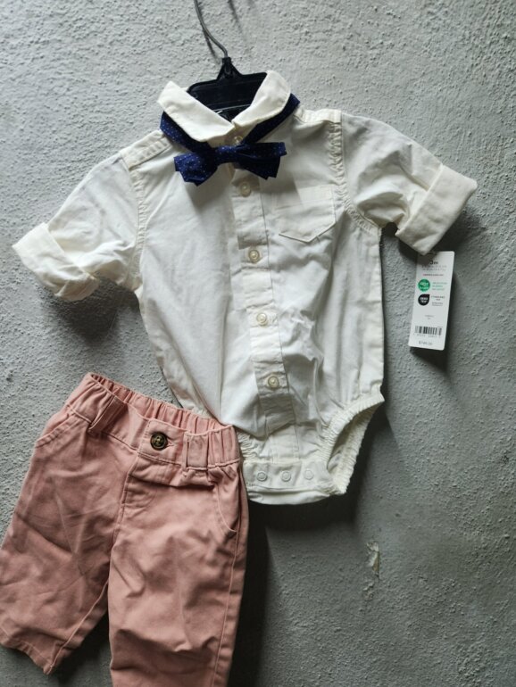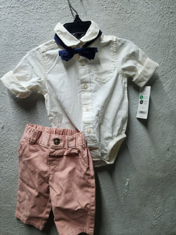 Hermoso conjunto marca carter's talla 3 meses completamente nuevo con etiqueta trae un hermoso corbatín que le da un look aun mas lindo al outfit , la camisita es en tono beige claro y el pantalón en rosa palo esta realmente hermoso , su precio real es de $749