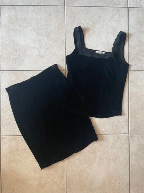 Conjunto coreano vintage de terciopelo negro. Blusa de manga corta con encaje y falda de lapiz arriba de la rodilla. La falda está descocida de la apertura de la parte de atrás (detalle en fotos) pero se puede arreglar sin problema