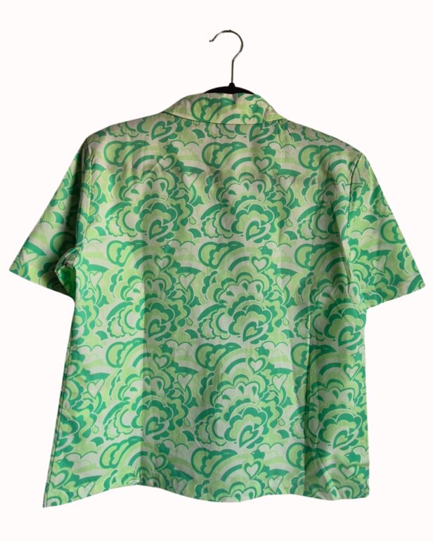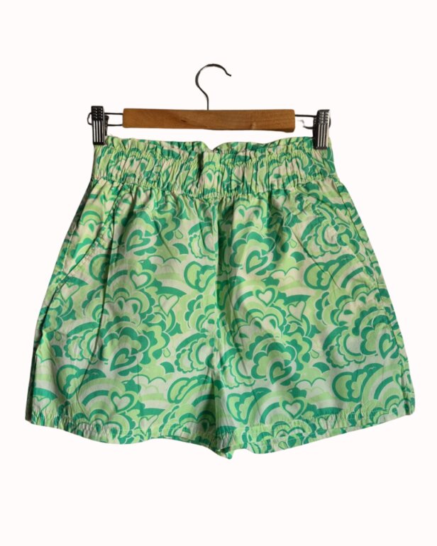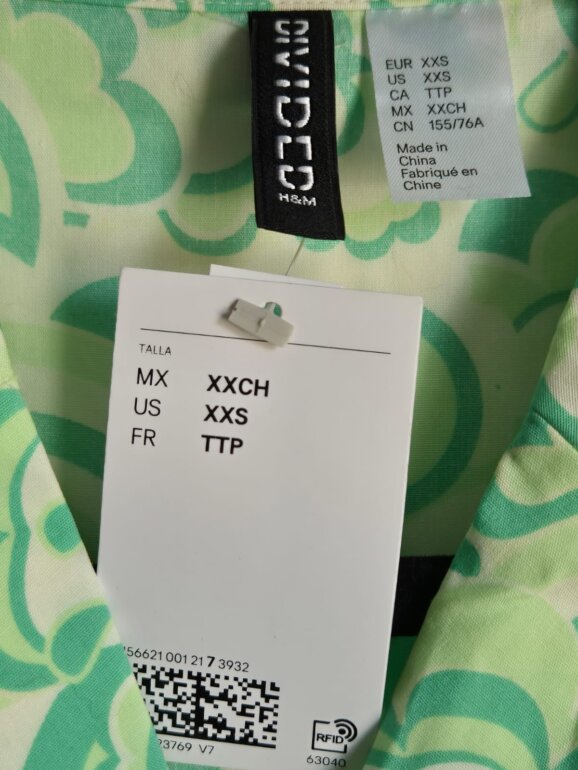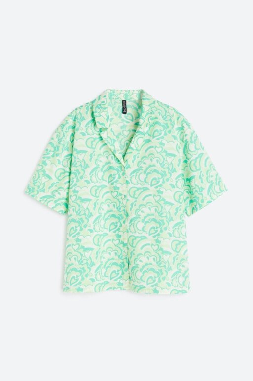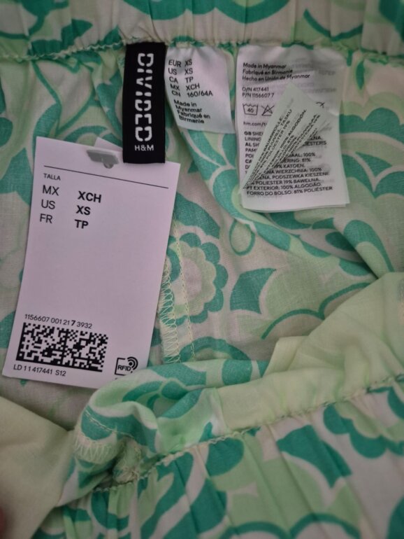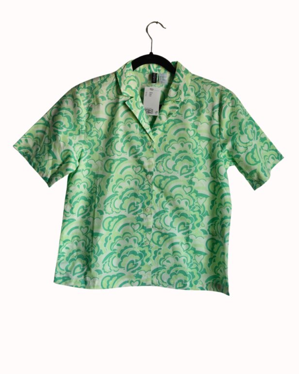 Conjunto H&M nuevo con etiqueta. Camisa oversized XXCH y short XS. Tela ligera con estampado verde súper fresco y favorecedor. Camisa: busto 48 cm, largo 56 cm, manga 22 cm, espalda 52 cm. Short con resorte y bolsillos: cintura 32 cm (estira 3-4 cm), largo 43 cm. Ideal para primavera/verano, úsalo junto o por separado