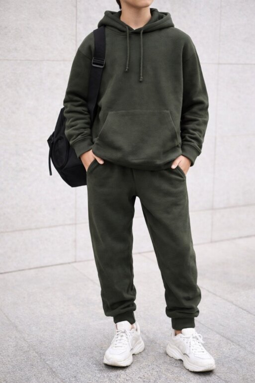 Talla 13-14 yo lo veo unisex, pantalón con bolsillos y sudadera con bolsillo frontal. En perfecto estado un solo uso
