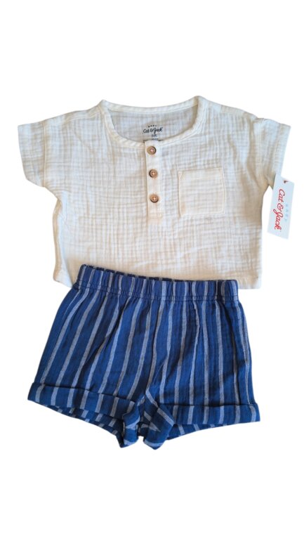 Conjunto de 2 pzas para bebe niño talla 3-6 meses, playeritas blanca y shorts azul con lineas, nuevo con etiqueta sin detalles