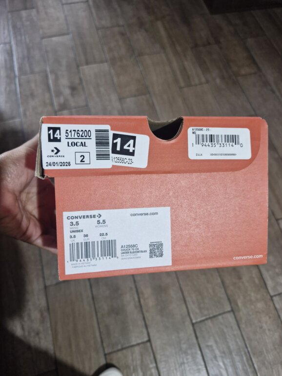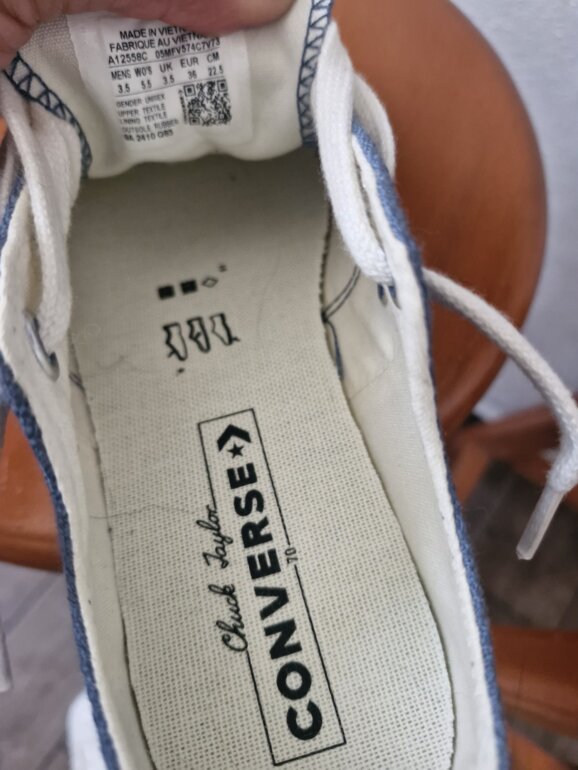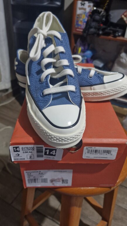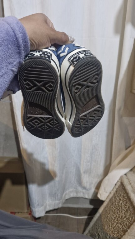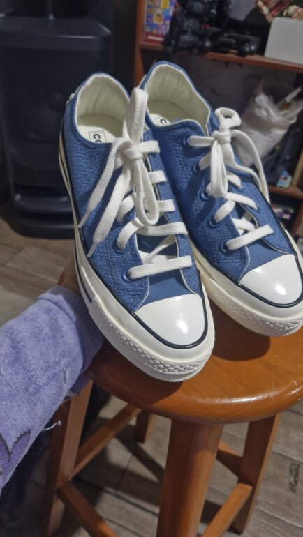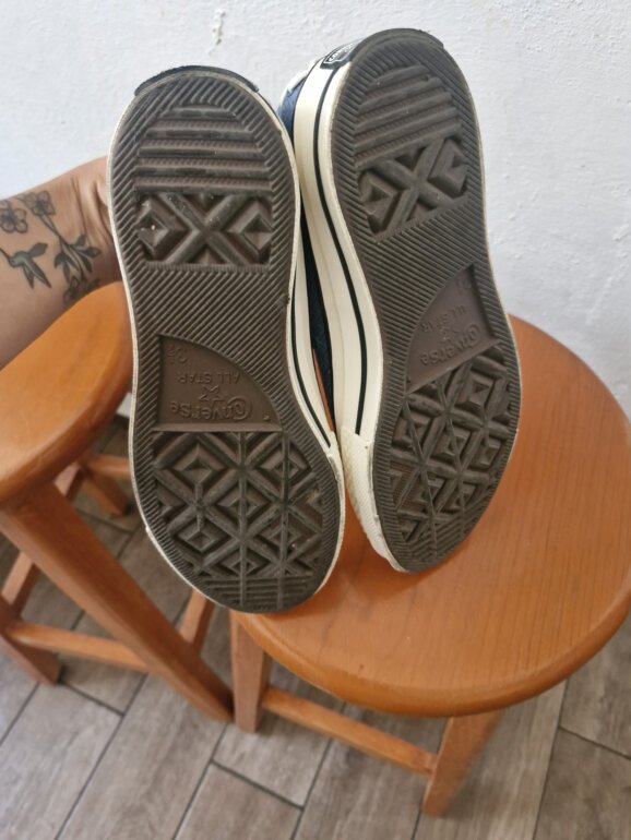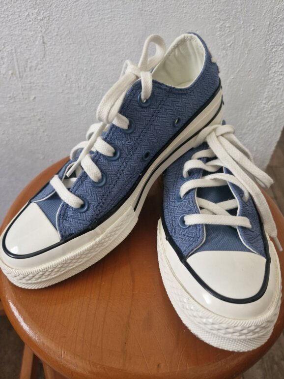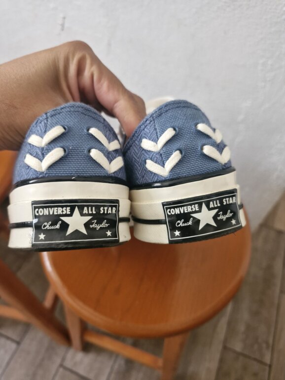 Hermosos converse azul marido, con textura, en la parte de atrás tiene detalles de agujetas entrelazadas. Son estilo vitage. La etiqueta dice 22.5 pero quedan a un 23 sin problema. Solo tienen una sola puesta, no tienen detalles.