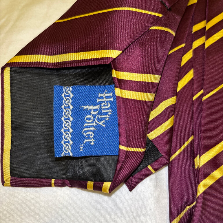 Corbata de líneas diagonales rojo con amarillo con el logo de Gryffindor perfecto para disfraz.