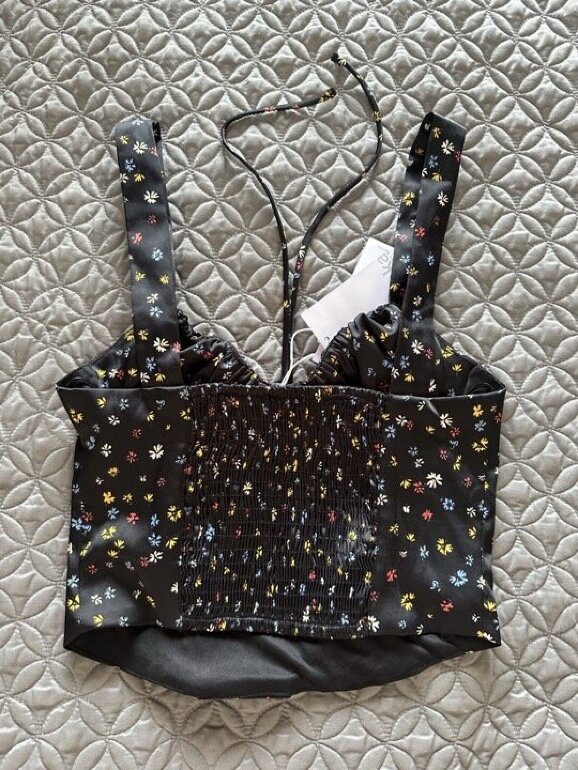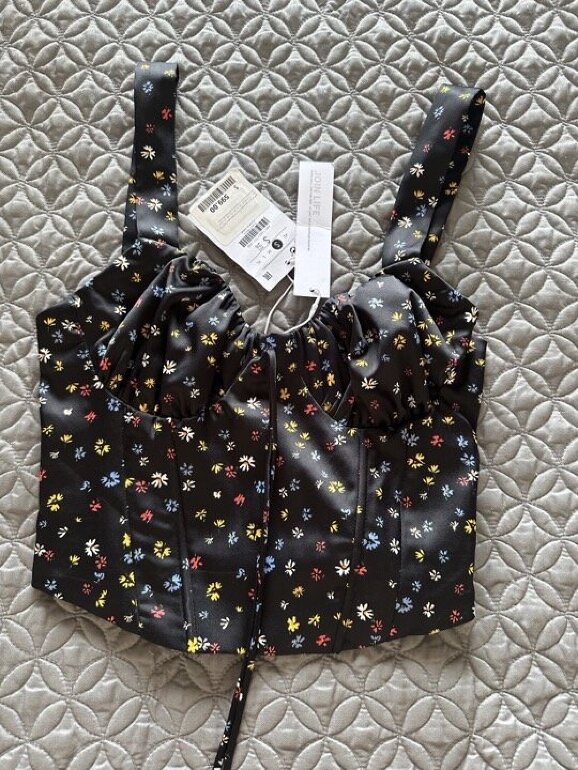 Corset negro nuevo, estampado de pequeñas florecitas. Cintura 32cm, pecho 37, de hombro a cintura 44cm. Tiene resorte la parte de atrás para adaptarse al cuerpo