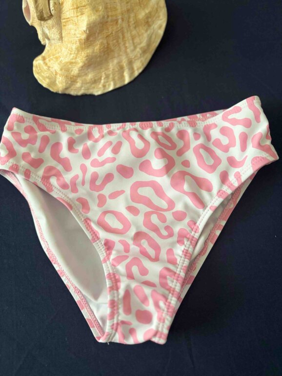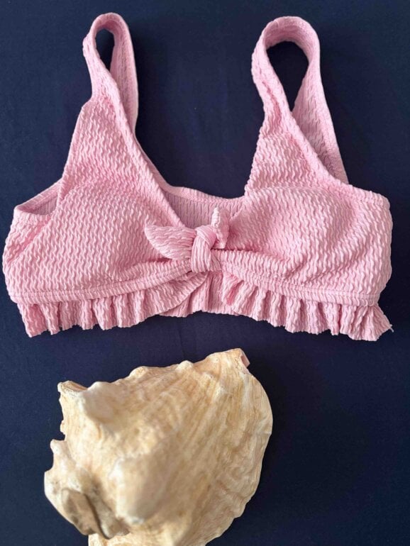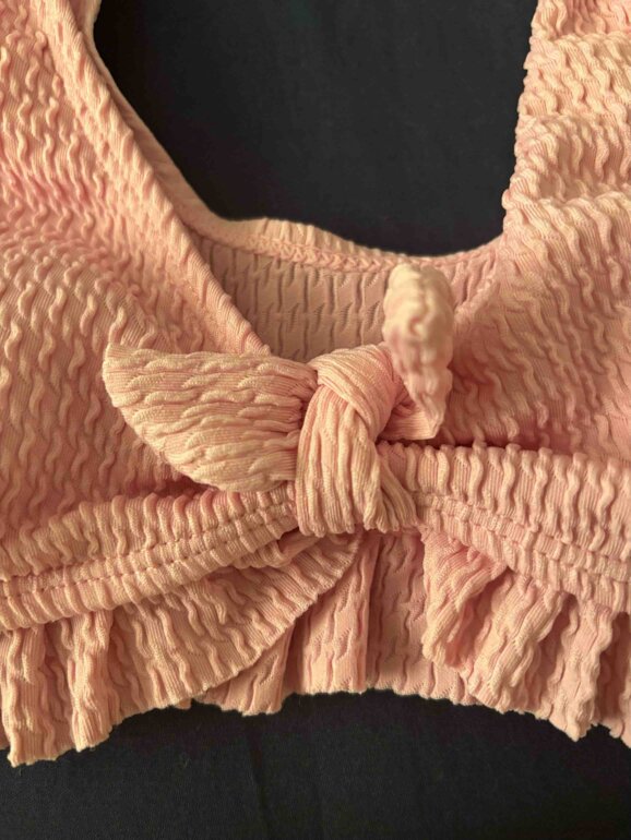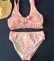 Hermoso bikini para niña, con detalles tanto en el cazón como tipo vaca, y el el top plisado y trae copas