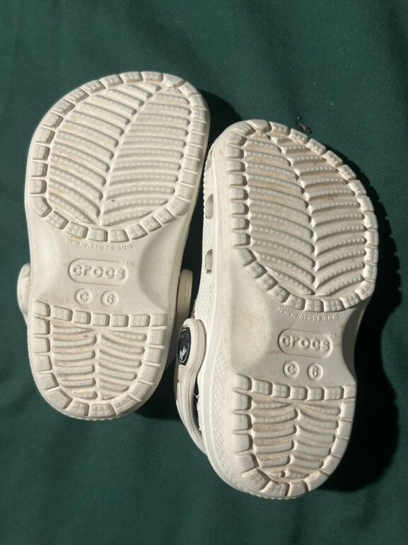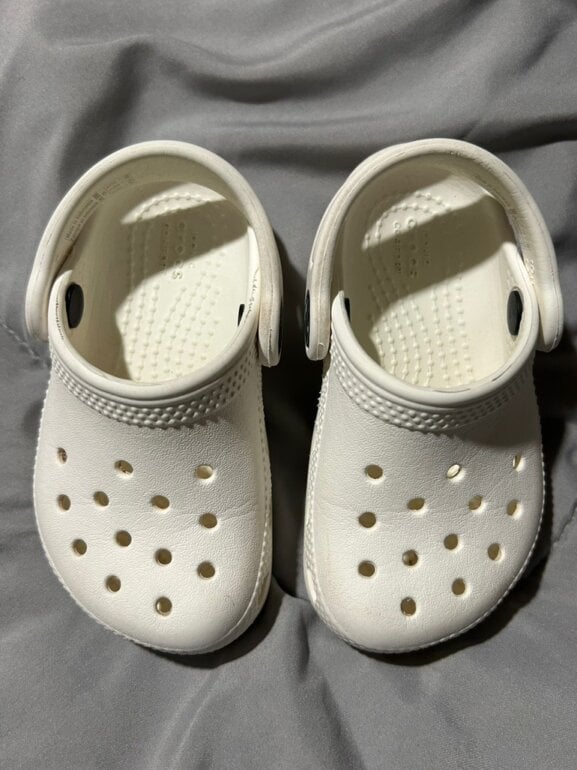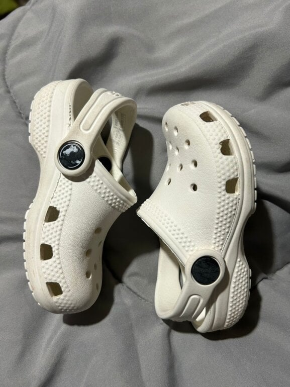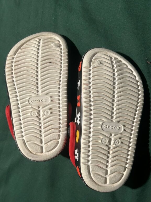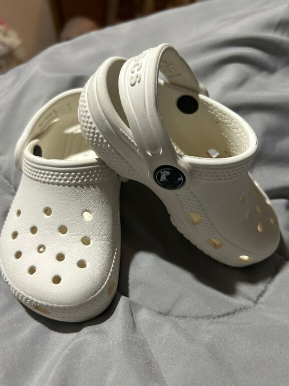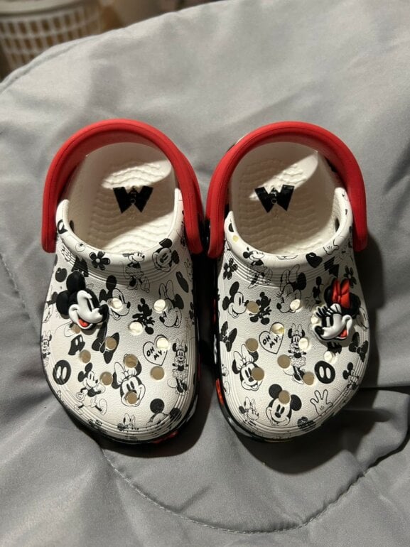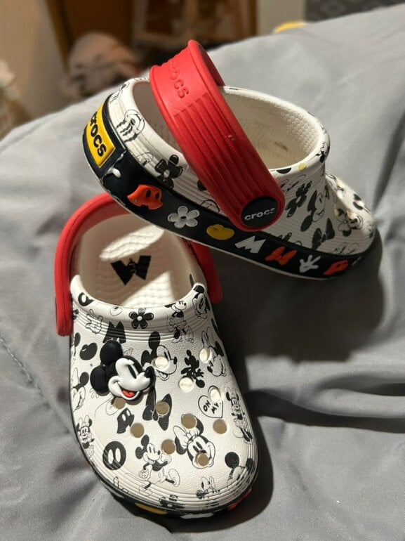 Dos pares de crocs De la misma talla Uno estampado con imágenes de Mickey y Mimi y el otro es completamente blanco muy hermosos