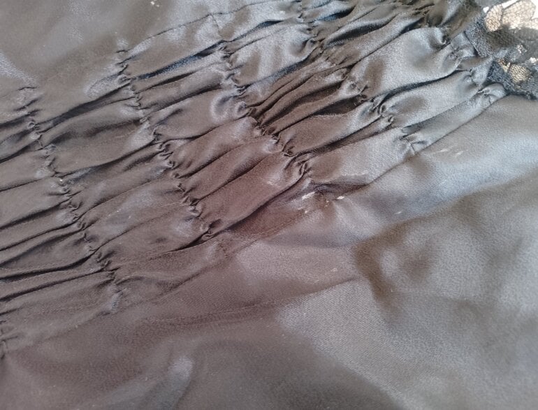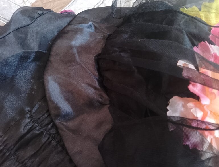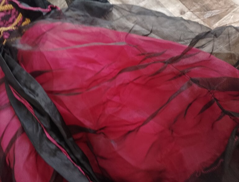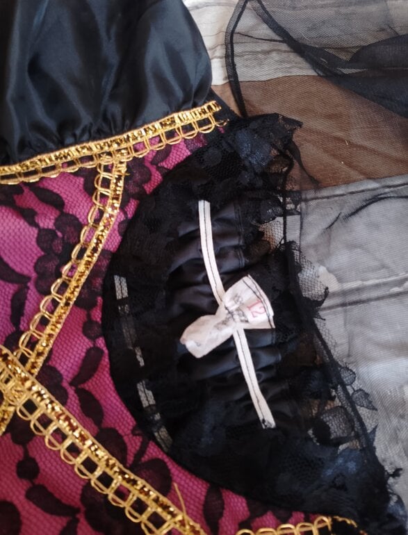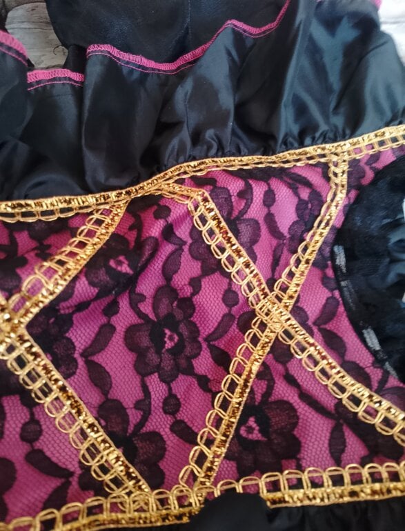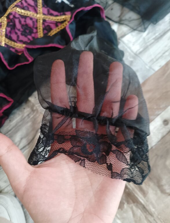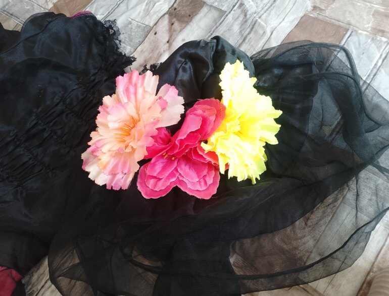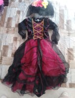 Disfraz catrina tiene doble forro y tiene tul para darle para volumen al vestido tiene detalles de encaje en el área del pecho y de las muñecas ,tiene su sombrero con flores llamativas solamente del área de la espalda está como llena poquito de blanco pero con la lavada se va