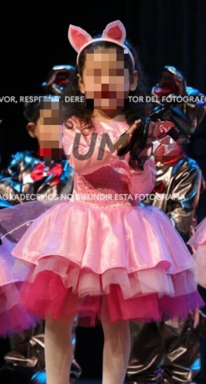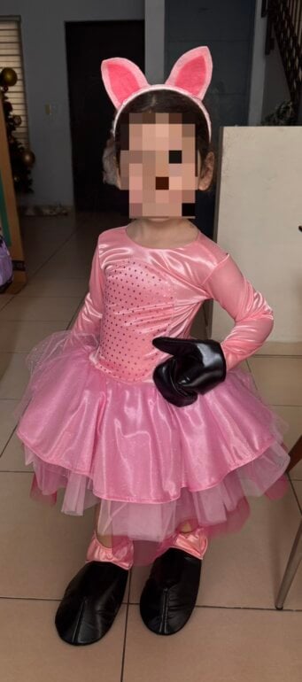 Disfraz de cerdito de Toy Story. Incluye cubre manos y pies. Color rosado con pancita de lentejuela y falda con triple tul. Incluye diadema de orejitas.