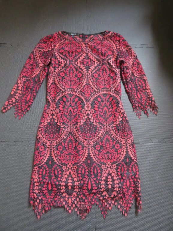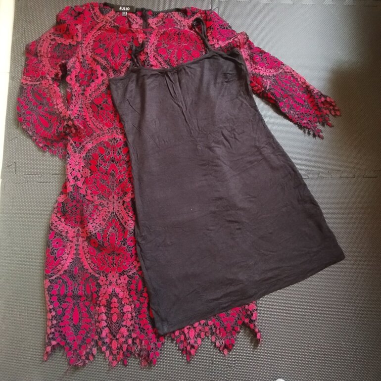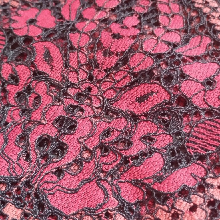 Vestido de encaje rojo con detalles negros, suave al tacto, cómodo. Con un top negro ligero, stretch, sin cierre. Ideal para una cena formal, una comida con amig@s. O para un día que te quieres lucir en la oficina o solo para sentirte hermosa.