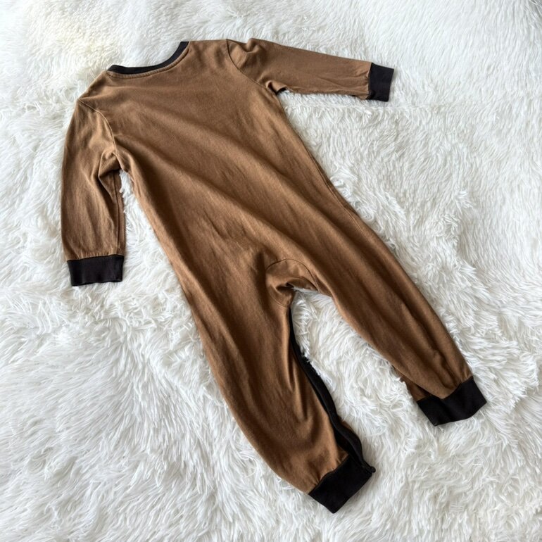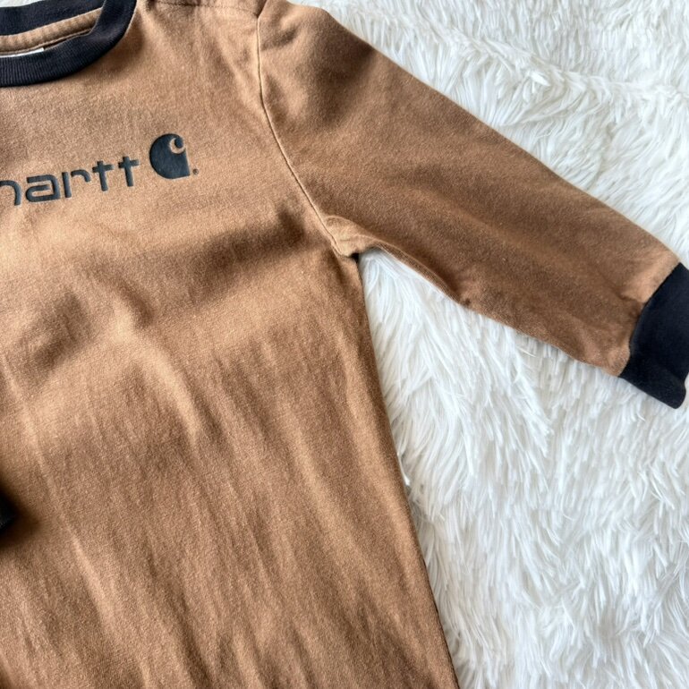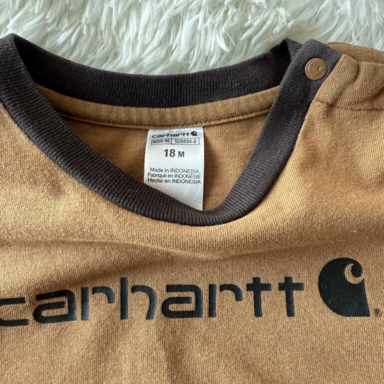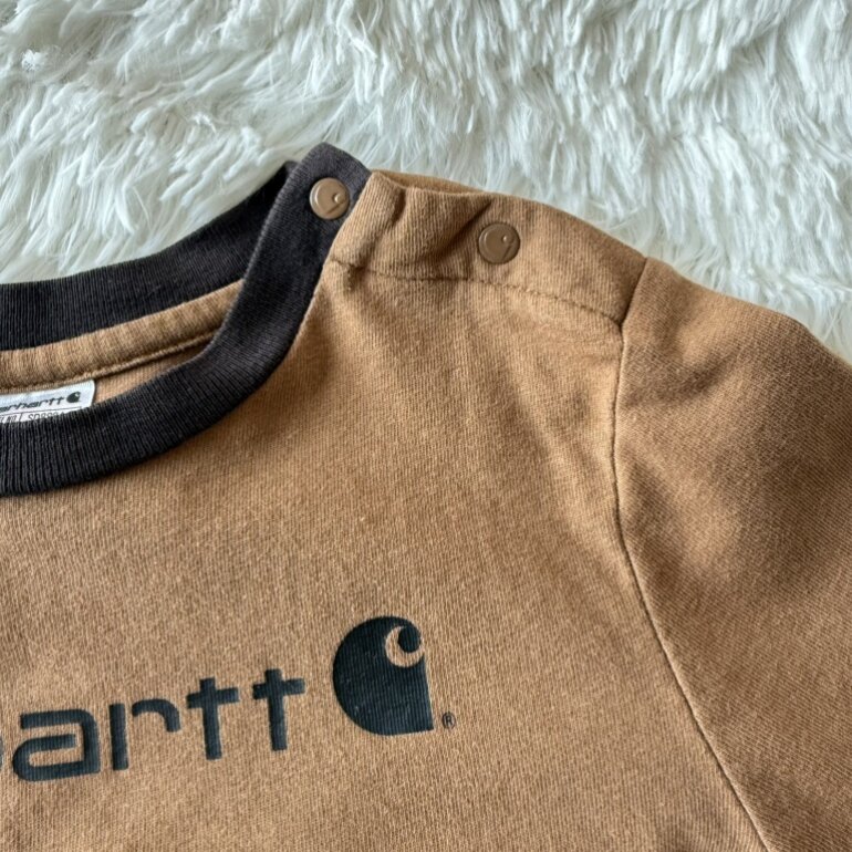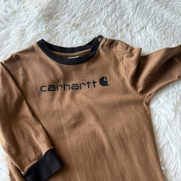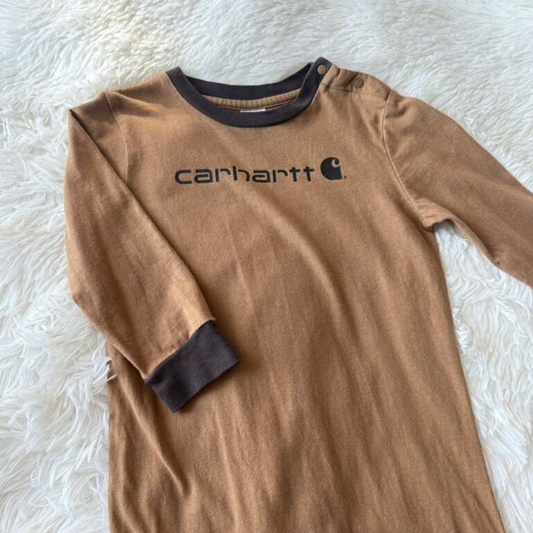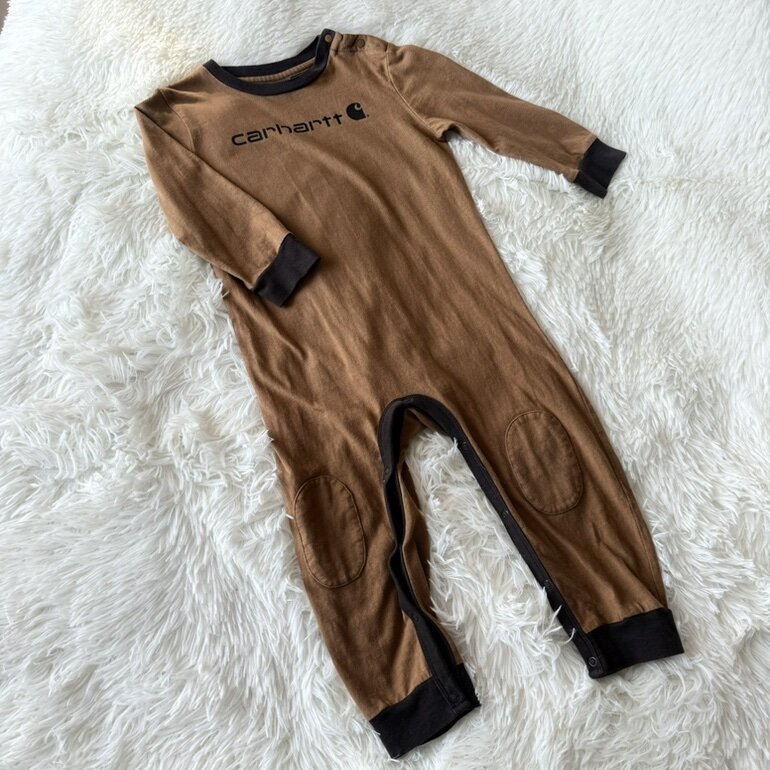 Enterizo original Carhartt en tono café, ideal para bebé de 18 meses. Confeccionado en algodón suave y cómodo, perfecto para el uso diario. Cuenta con broches en la parte inferior que facilitan el cambio de pañal y puños en contraste que brindan mejor ajuste.