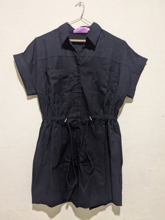 Moderno enterizo corto de la marca BOMY Collection, ideal para un look casual y cómodo. Confeccionado en tela ligera y fresca, cuenta con dos bolsillos frontales, cierre frontal con botones y ajuste en la cintura con cordón, lo que permite un mejor entalle. Su diseño versátil en color negro lo hace perfecto para el uso diario, salidas o para combinar con accesorios y crear un look más arreglado.